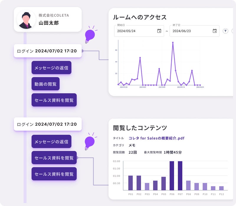 例えば、商談後に顧客がどの資料に興味を持ち、どれくらいの時間閲覧したかを分析し、それに基づいた適切な提案をサポートします。