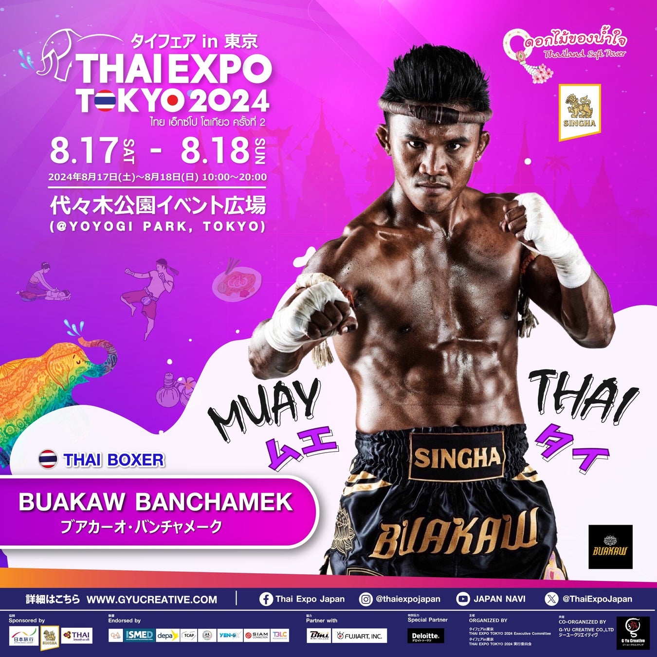 代々木公園にて2024年8月17日(土)8月18日(日)開催される、日本最大級のタイポップカルチャーイベント「タイフェアin東京~THAI EXPO TOKYO 2024(タイエキスポ)」に、ムエタイ界のレジェンド 「BUAKAW BANCHAMEK(ブアカーオ・バンチャメーク)」の参加が決定しました。当日会場ステージにて、ムエタイのスペシャルパフォーマンスはもちろん、試合前の勝利を祈る舞「ワイクルー」や歌唱パフォーマンスなども披露します。