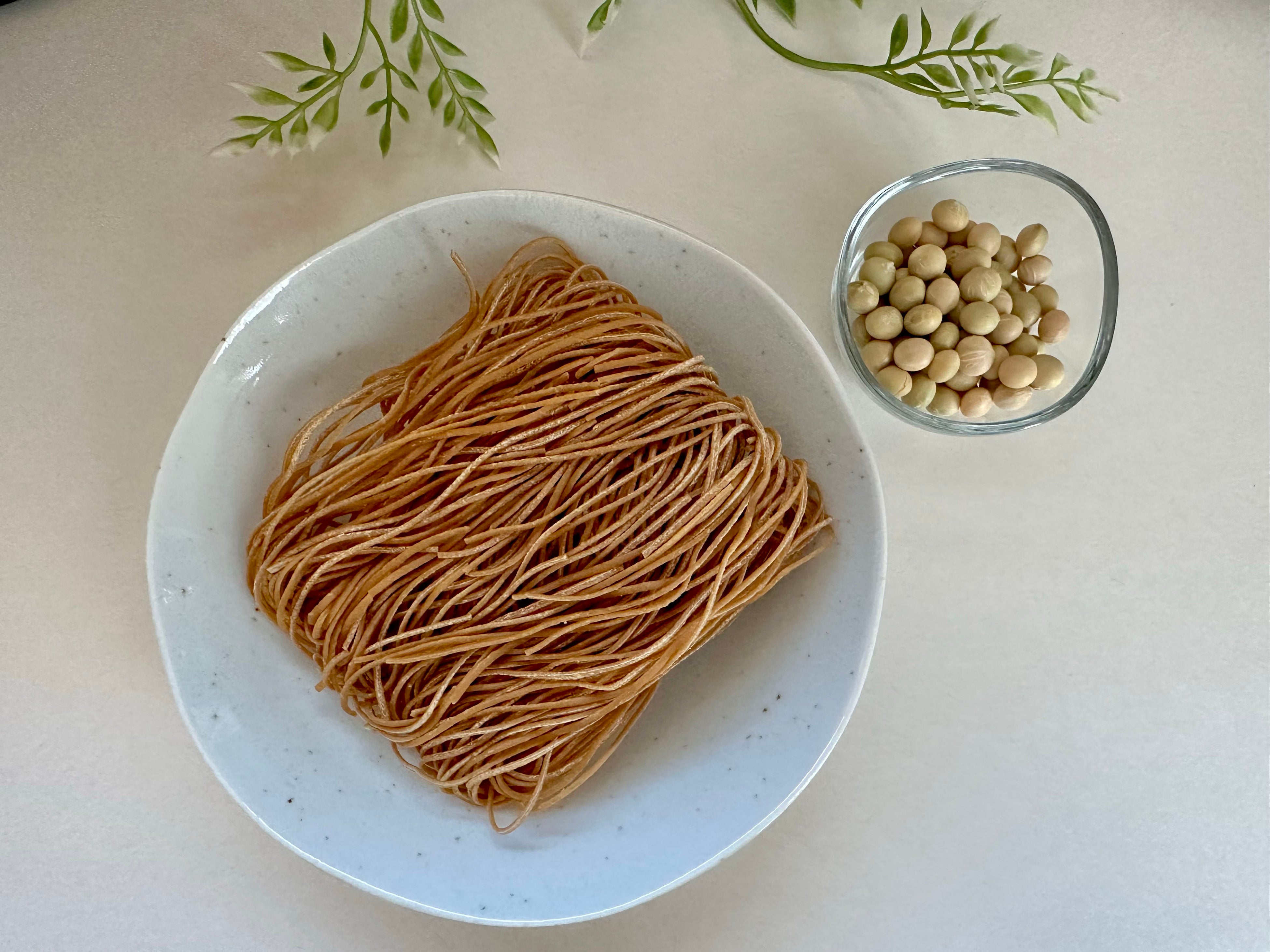 美肌大豆では、豊かな風味をもつ、国産丸大豆100%を使用した大豆ミートを取り扱っています。国産丸大豆100%の大豆ミートを活かした大豆麺はないかと考えました。
