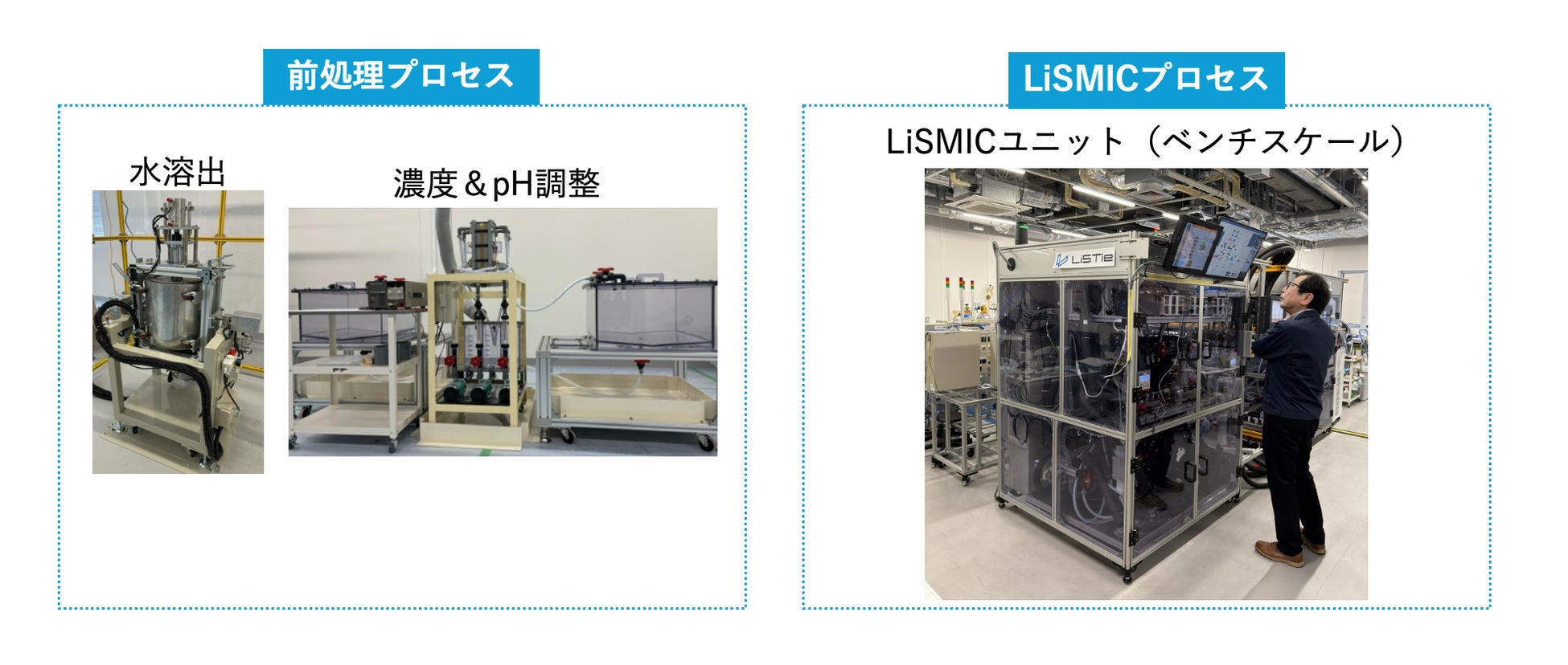 本ベンチプラント実証機は、使用済の耐火物をLiSMICに最適な溶液に調整する前処理プロセス、当該溶液から超高純度リチウムを回収するLiSMICプロセスから構成され、24時間の連続運転が可能な装置です(図1)。LiSTie内での最終調整の後、2026年5月より、耐火物や新素材の総合メーカーの株式会社TYKと共同研究として、水酸化リチウムを1.5kg/日のペースで回収する実証試験を行います。