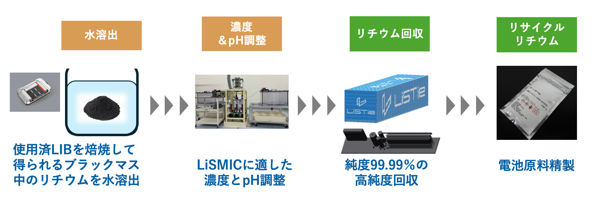 LiSMICはリチウム含有溶液を原液とするため、使用済LIBのような固体の場合は水溶液状態とする前処理プロセスが必要です。そこでLiSTieでは、使用済LIBを焙焼して得られるブラックマスを水に浸漬し、リチウムを含む水に溶けやすい元素を水溶出した後、LiSMICに適したリチウム濃度とpHに調整します。そして、LiSMICにて超高純度リチウムとして回収し、リサイクルリチウムを製造します(図4)。