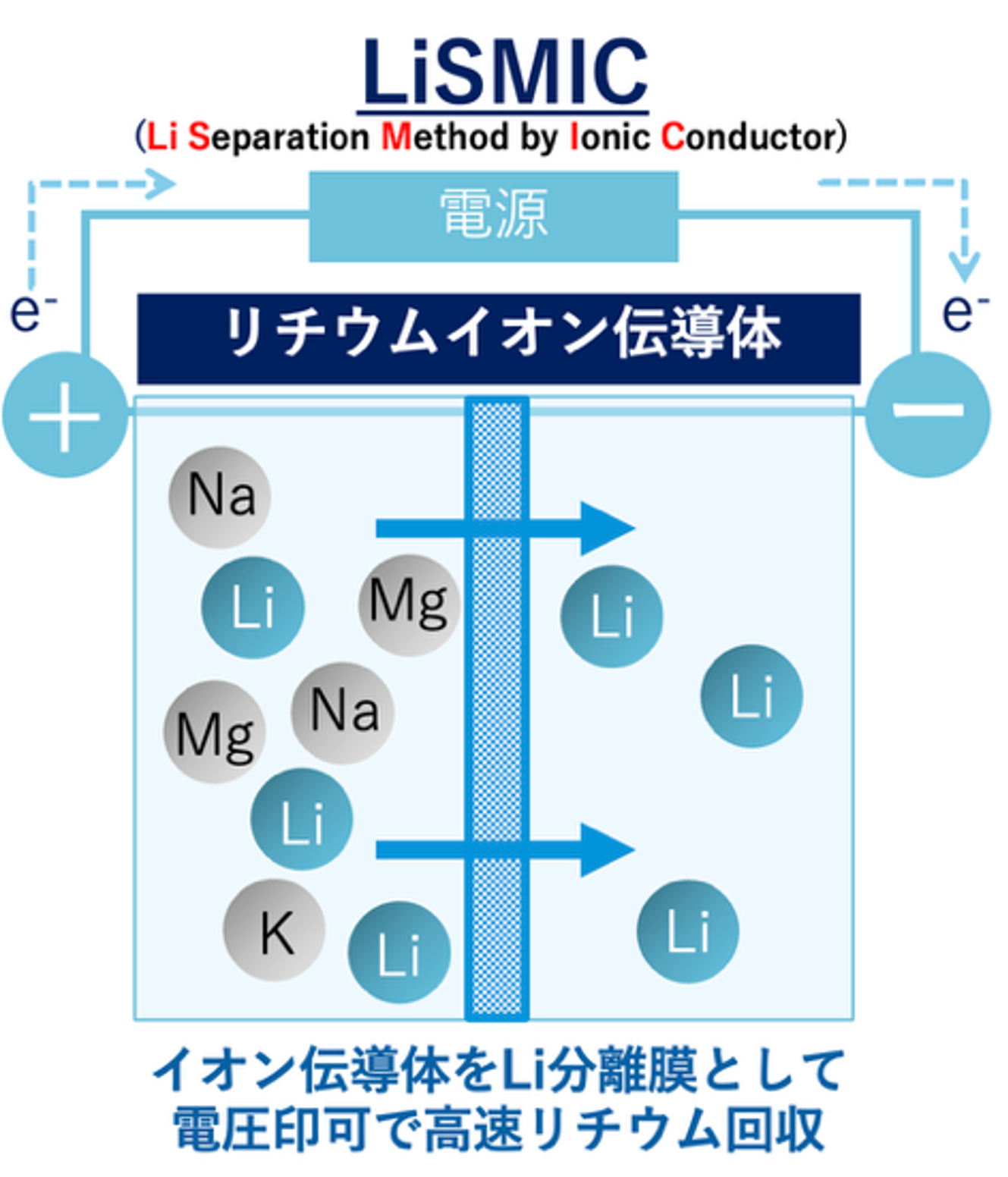 当社技術LiSMIC(Li Separation Method by Ionic Conductor)は(図3)、イオン伝導体というセラミックス製の板をリチウム分離膜とすることで、これまで困難であった有限であるリチウム資源の安定調達と循環(リサイクル)を市場に定着させます。