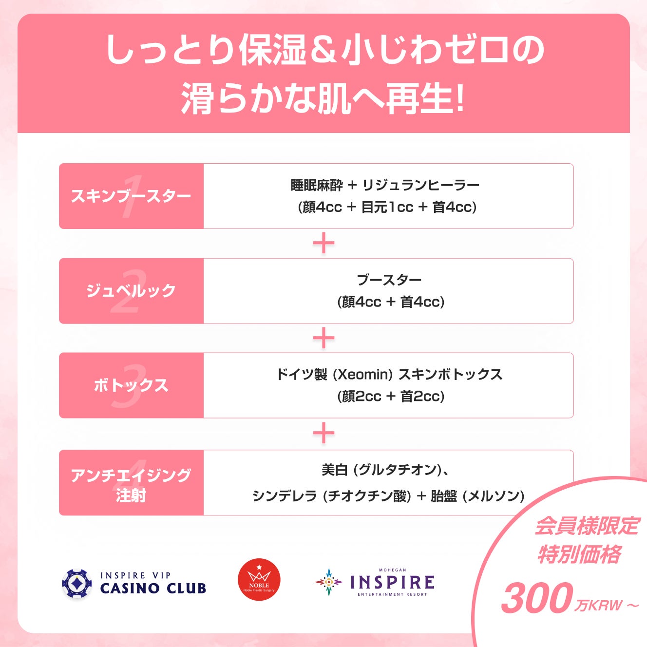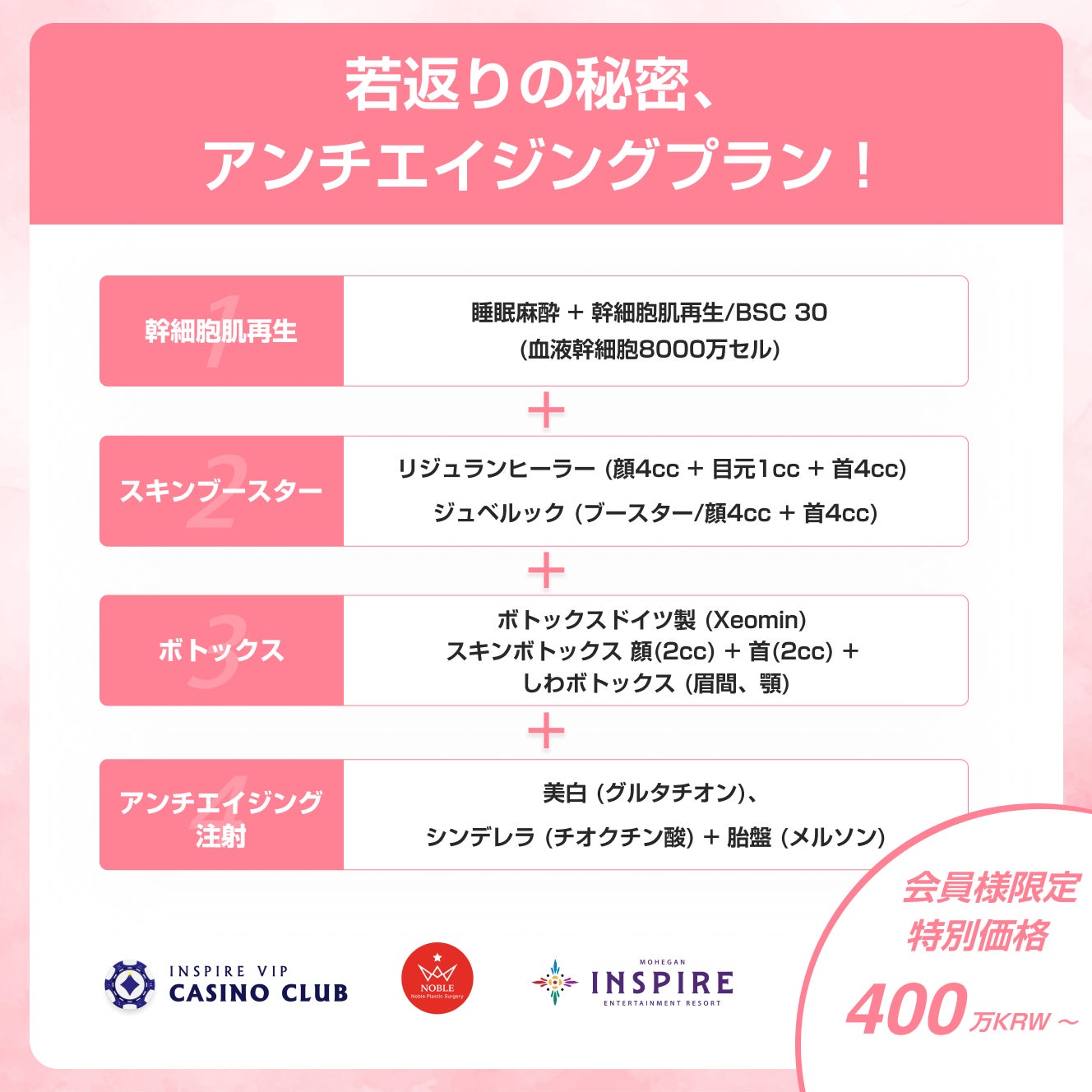 株式会社INSPIRE VIP CASINO CLUB(本社:東京都目黒区)は、2024年12月1日より韓国のノーブル美容クリニックと提携し、カジノクラブ会員様限定の特別美容プランを提供開始いたしました。本プランでは、韓国国内でも高評価を得ており、INSPIREからも車で約25分の場所である仁川松島に位置するノーブル美容クリニック(院長: キム・ヨンフン)とのコラボレーションにより、お得に最新のアンチエイジング施術をお届けします。