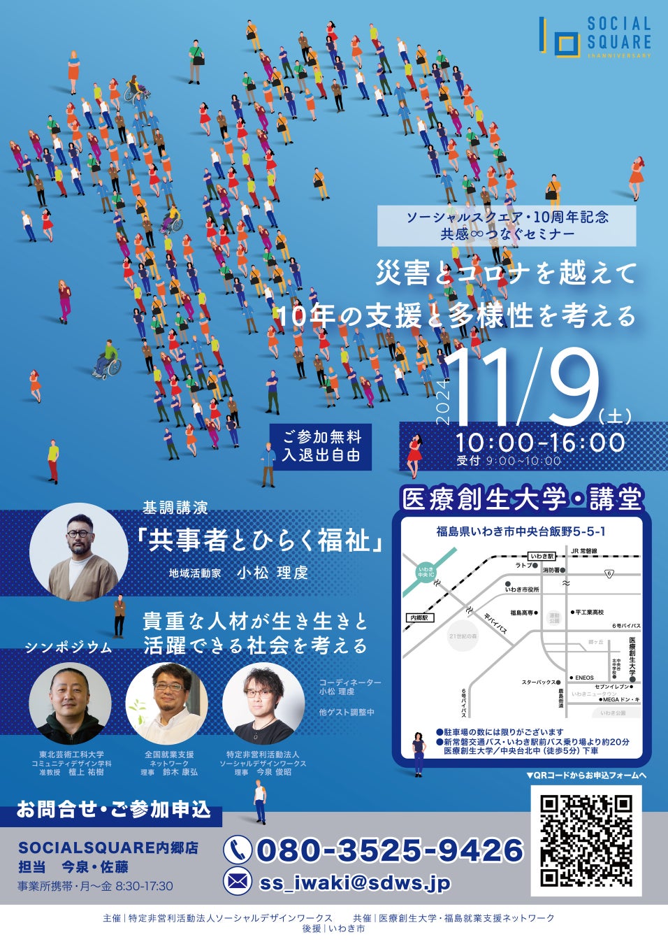 2024年11月9日(土)、NPO法人ソーシャルデザインワークス(福島県いわき市・代表理事 北山 剛)は運営するSOCIAL SQUARE内郷店の開所10周年を迎えるにあたり、「災害とコロナを越えて:10年の支援と多様性を考える」記念イベントを開催いたします。この10年間に経験した多様な課題や変革を振り返り、未来の社会における多様性と共生のあり方を共に考える場といたします。皆さまのご参加を心よりお待ち申し上げます。