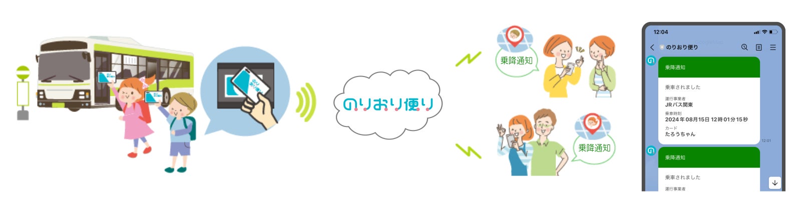 今回の実証実験では希望者を募り、希望する児童ひとり一人にICカードを配布、保護者のスマートフォンでLINE公式アカウント「のりおり便り」を友だち追加およびICカードを登録していただきます。児童がスクールバス乗車/降車時にICカードを読取機にかざすと、保護者は乗車/降車した時刻や停留所などの情報をPush通知で受け取ることができます。