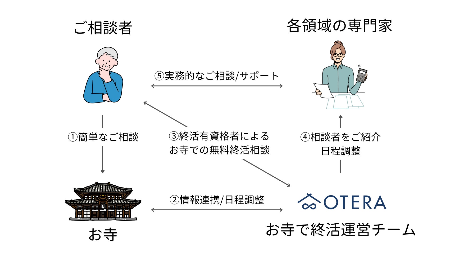 「お寺で終活」は、地域に根ざすお寺を起点とした終活サービスです。全国のお寺は、無料提携いただくだけで、終活の専門家と連携して”無料終活相談を受ける""終活サポートができる”体制を整えることができます。檀信徒の終活サポートはもちろん、無縁仏や孤独死の社会課題の解決を目指し、「一人暮らしの高齢者や身寄りのない高齢者」を中心とした地域の高齢者向けの終活サポートを行う地域社会インフラサービスです。