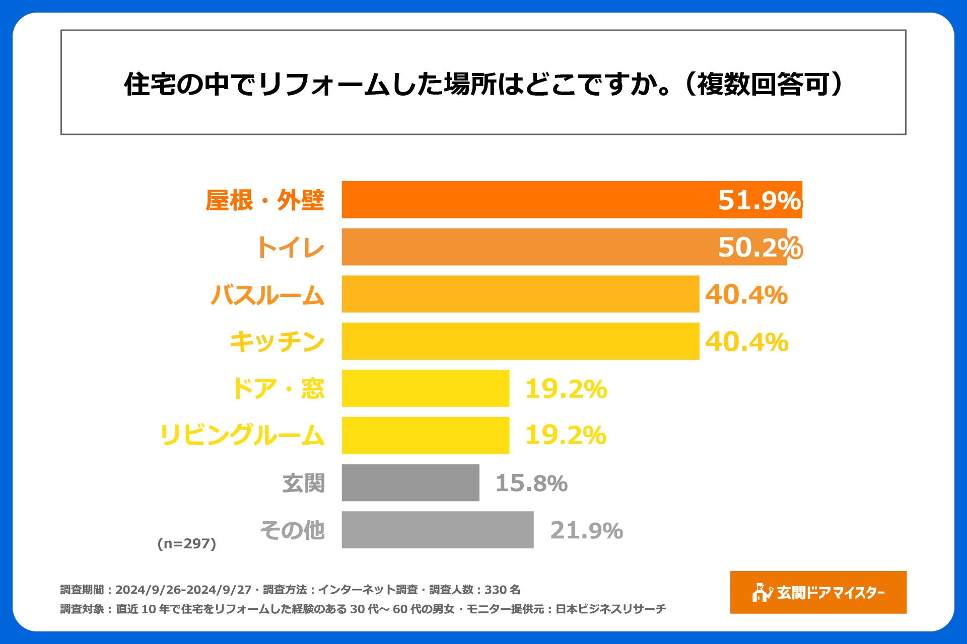 次に、住宅のリフォームを業者に依頼したと回答された方に「住宅の中でリフォームした場所」を尋ねる設問で、最も多かった回答は「屋根・外壁」で51.9%、次いで「トイレ」が50.2%、その後に「バスルーム」と「キッチン」がそれぞれ40.4%と同率で続く結果となりました。また、「ドア・窓」、「リビングルーム」「玄関」にも一定数回答が集まりました。この結果から業者にリフォームを依頼する内容は、外装や水回りのリフォームが特に多いものの、その他にも様々な場所をリフォームしていた、という実態が明らかになりました。