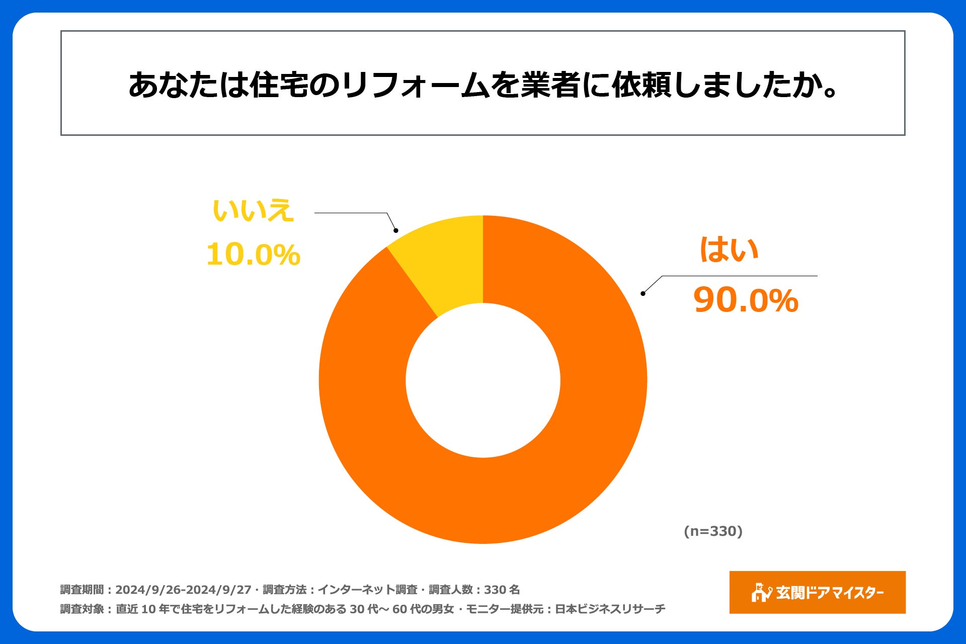 まず、「住宅のリフォームを業者に依頼したか」という設問への回答では、「はい」が90.0%と大多数を占める結果となりました。この結果から、直近10年で住宅をリフォームした経験のある方の大半は、業者に依頼して住宅のリフォームを行っていたことが明らかになりました。