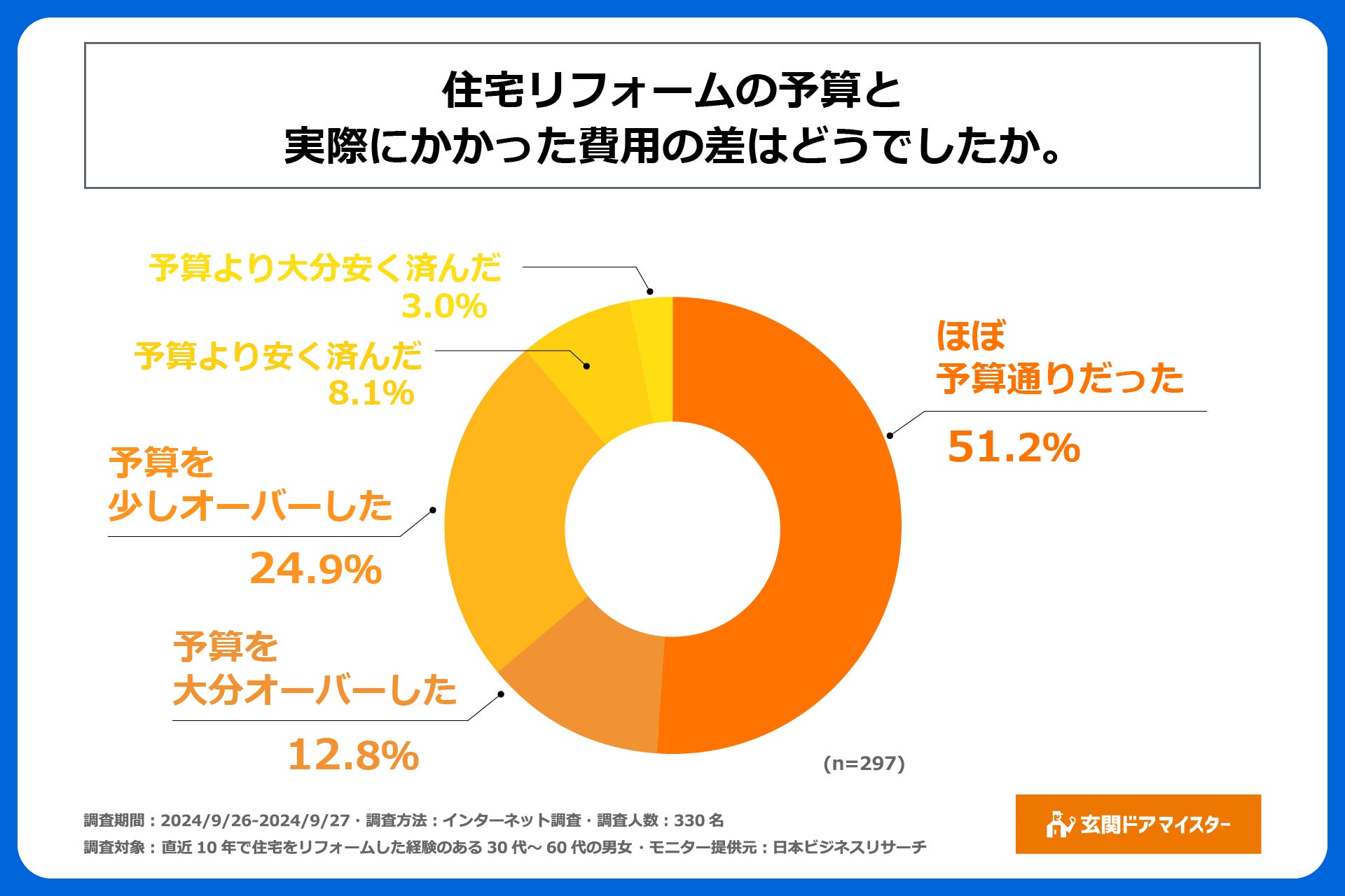 調査の最後に、住宅のリフォームを業者に依頼したと回答された方に「住宅リフォームの予算と実際にかかった費用の差」を問う設問への回答では、「ほぼ予算通りだった」が51.2%と約半数を占めました。一方、「予算を少しオーバーした」は24.9%、「予算を大分オーバーした」は12.8%で、住宅のリフォームを業者に依頼した方の約4割が予算よりも実際に発生した費用の方が高くなったということが判明しました。
