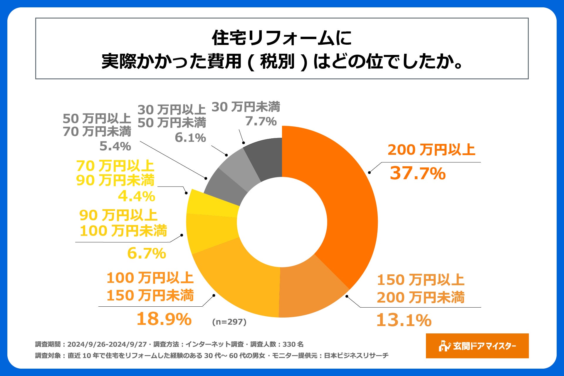 また、住宅のリフォームを業者に依頼したと回答された方に「住宅リフォームに実際かかった費用」を尋ねる設問で最も多かった回答は「200万円以上」で37.7%でした。次いで「100万円以上150万円未満」が18.9%、「150万円以上200万円未満」が13.1%と続き、これらの回答を合計すると回答率は約70%となり、住宅のリフォームを業者に依頼した方の約7割が「100万円以上」の費用をリフォームにかけた、という事実が明らかになりました。