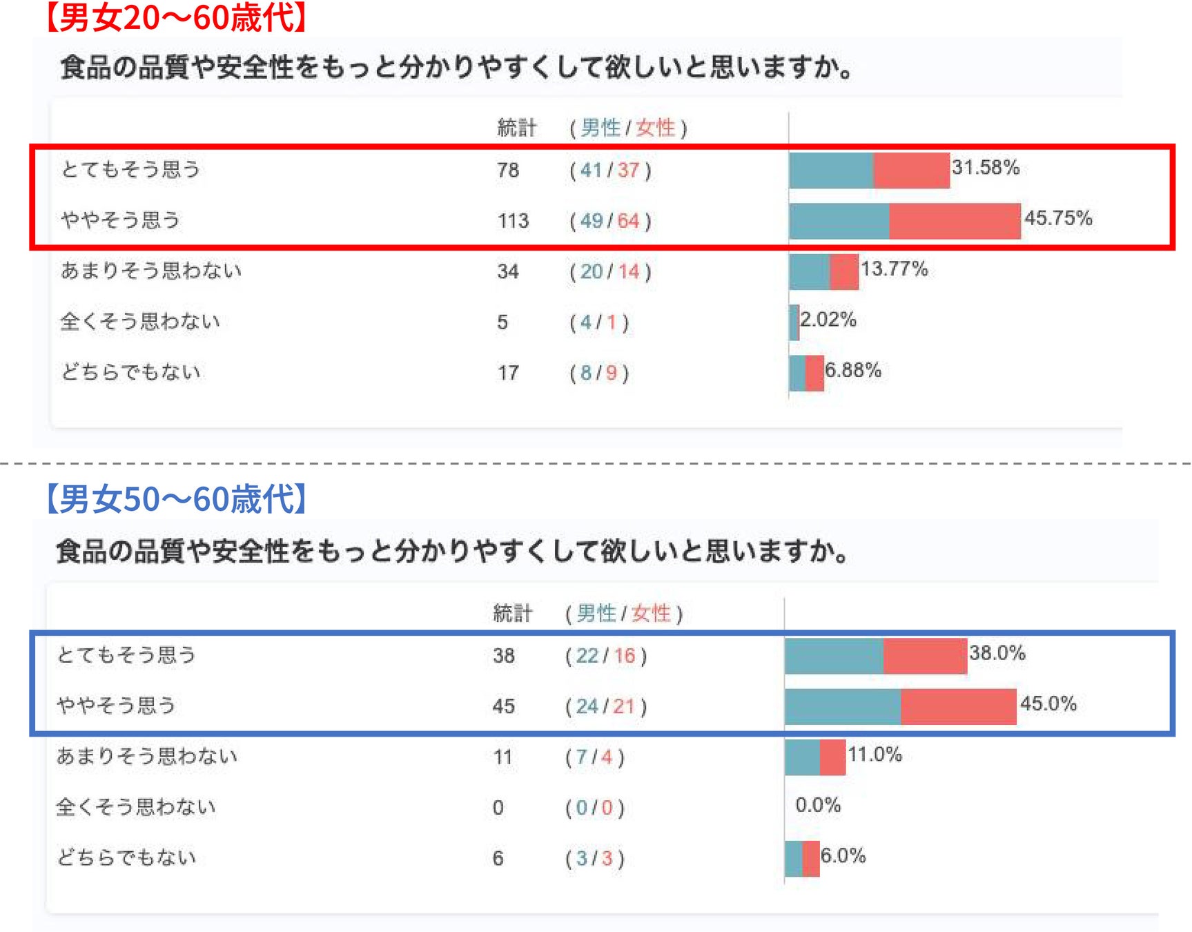 ※ 男女50~69歳の83.0%が、「食品の品質や安全性をもっと分かりやすくしてほしい」と回答しています。食品を選ぶ際、現状の情報では不十分と感じており、より直感的で理解しやすい情報開示の必要性がうかがえます。