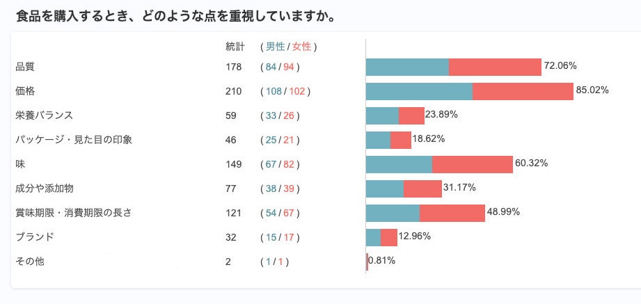 ※ 食の安全意識が高まる中で、消費者は成分や添加物、賞味期限なども気にしていますが、これらの要素も最終的には「品質」の高さと直結しています。信頼できる品質は、安心や健康意識の高まりを背景に、より重視される傾向が強まっています。