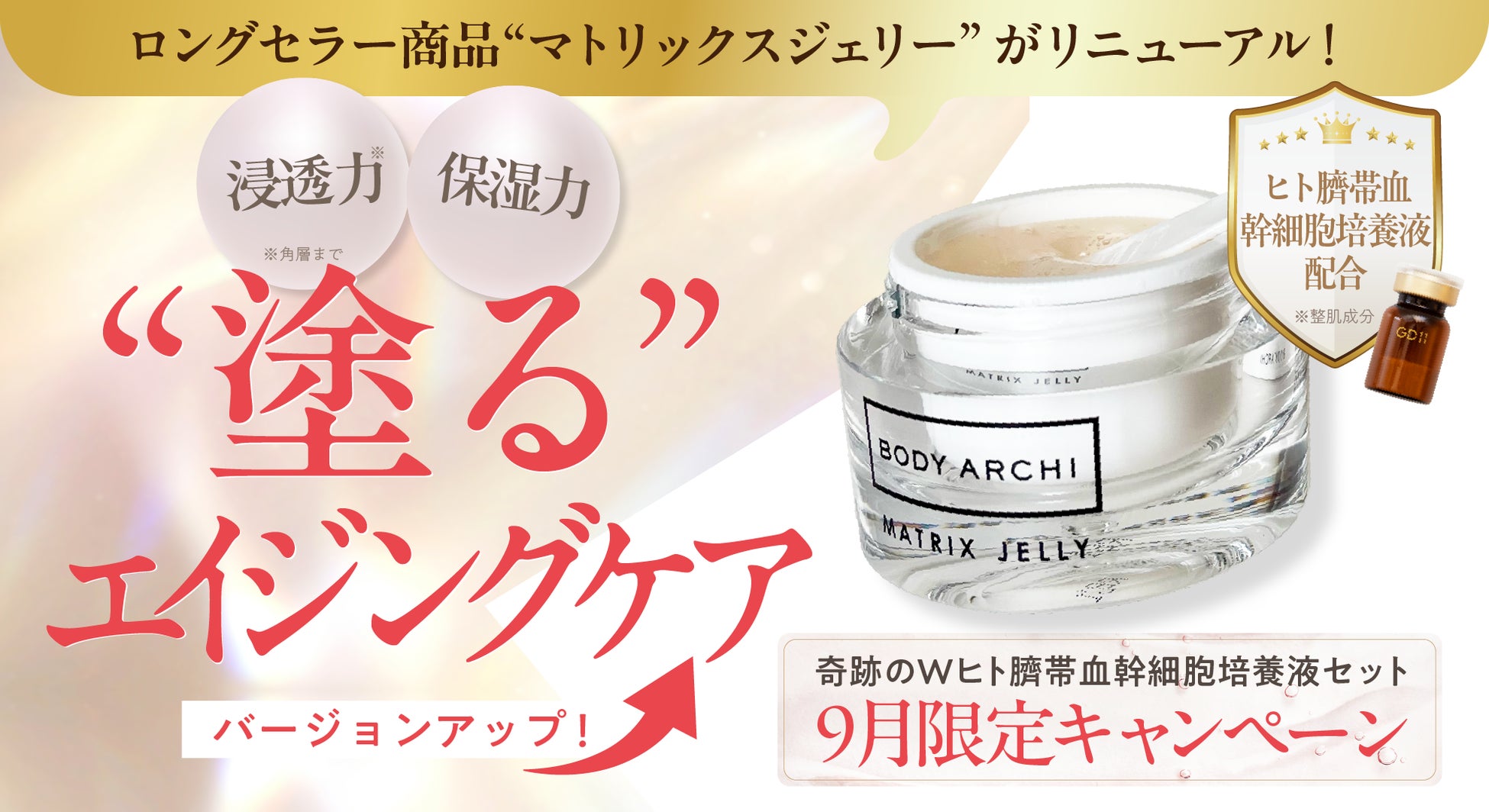 全国40店舗以上に「ドクターズ セルフエステ BODY ARCHI」を展開する株式会社ボディアーキ・ジャパン(本社:東京都渋谷区、代表取締役社長:滝 浩介、以下 BODY ARCHI)は、肌の浸透(※1)にこだわったブラントオリジナルの美容ジェリー「MATRIX JELLY(マトリックスジェリー)」の成分をヒト臍帯血幹細胞培養液(※2)配合にバージョンアップさせ本日2024年9月3日(火)より販売いたします。