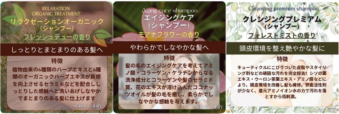 上記3種類(シャンプー・トリートメント共)を準備して様々な髪の毛や頭皮の悩みに対応できるシャンプーとトリートメントを準備いたしました。1回400円でお好きなシャンプーとトリートメントを購入でき、すずらんの湯の自然と光の調和の素敵な空間で特別な香りと高品質のシャンプー&トリートメントがお使いいただけます。