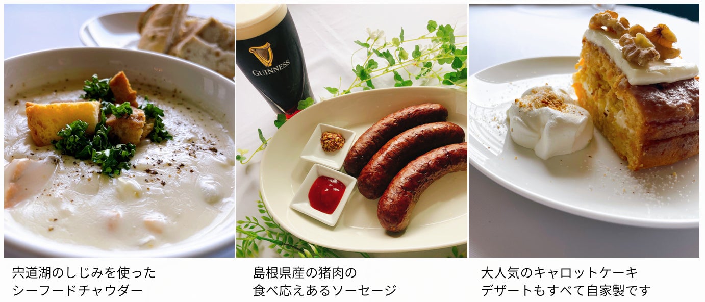 2015年に東京でレストランをオープンしてから9年、2021年島根に移転して3年。アイルランド⼈⼩泉⼋雲ゆかりの島根で、店主アランがこの島根の美味しい⾷材を使って⺟国アイルランドの本格的家庭料理を提供します。⾃家製の冷凍調理製品を百貨店等の⼩売店、通信販売業者や飲⾷店へ卸販売する他、島根県で開催されるパーティーへのケータリングもベジタリアン対応可能なメニューで対応。イートイン・スペースは⼟⽇祝⽇にオープン、ここでしか味わえないモーニング・ランチ・ディナーをご家族やご友⼈とご堪能ください。
