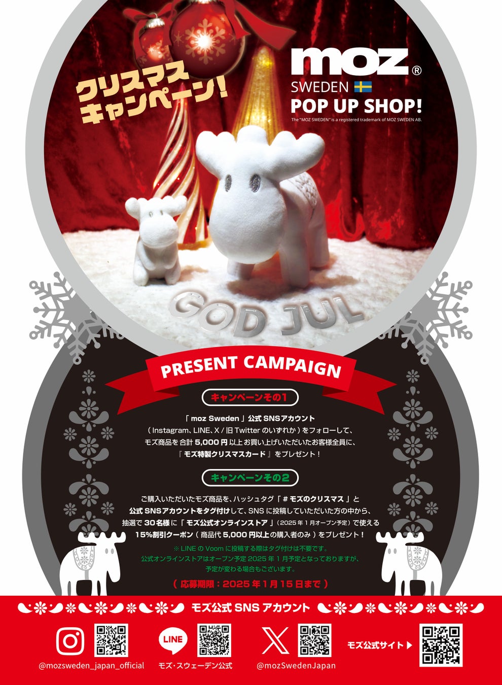 期間中には、「moz公式SNS」フォロワー限定のプレゼントキャンペーンも実施予定です。mozのブースで合計5,000円以上の商品ご購入の方に特別クリスマスカードをプレゼント!さらに、ブースで購入されたmozグッズを指定のハッシュタグをつけて投稿していただいた方の中から抽選で30名様に、2025年1月開設予定の公式オンラインショップで使える特別クーポンを進呈いたします。キャンペーンの詳細は下記。
