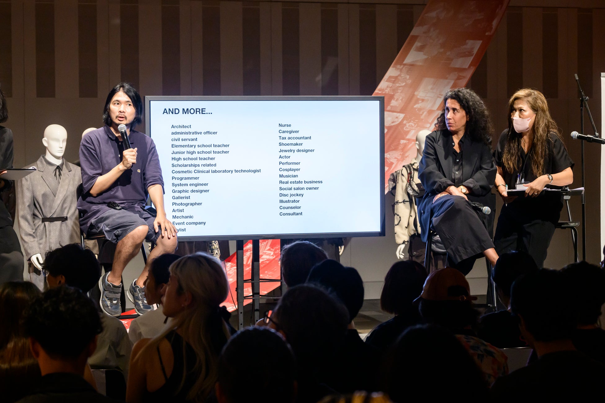 また、同イベントにて、スペシャルゲストを招いたトークイベントが会期中に2回開催されました。ソッツァーニ・ファウンデーション クリエイティブディレクターのサラ・ソッツァーニ・マイノと、coconogacco主宰の山縣良和氏による対談、そしてファッション・ジャーナリストの向千鶴氏とTAAKKデザイナーの森川拓野氏によるクロージングトークイベントです。どちらも一般の方にご覧いただけるよう、観覧の公募を行いました。