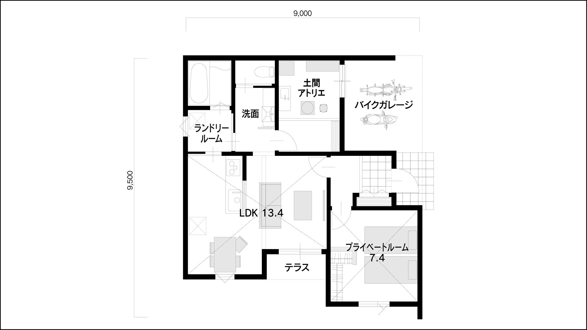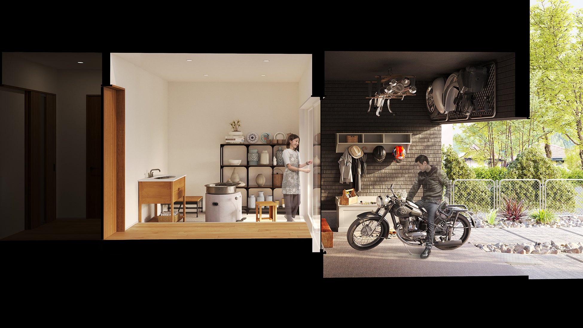 ガレージの半分を土間居室として利用したガレージハウスのアレンジタイプ。ガレージ空間を二分することで、一人はガレージで愛車のメンテナンスをし、もう一人は居室を趣味部屋として陶芸を楽しんだり絵を描いたりと、心地よい距離感で言葉を交わしながら、思い思いの趣味に没頭することができます。もちろん回遊導線も採用しているので、家事も効率良くこなせます。ますます趣味に時間が割けそうな、そんな住まいです。