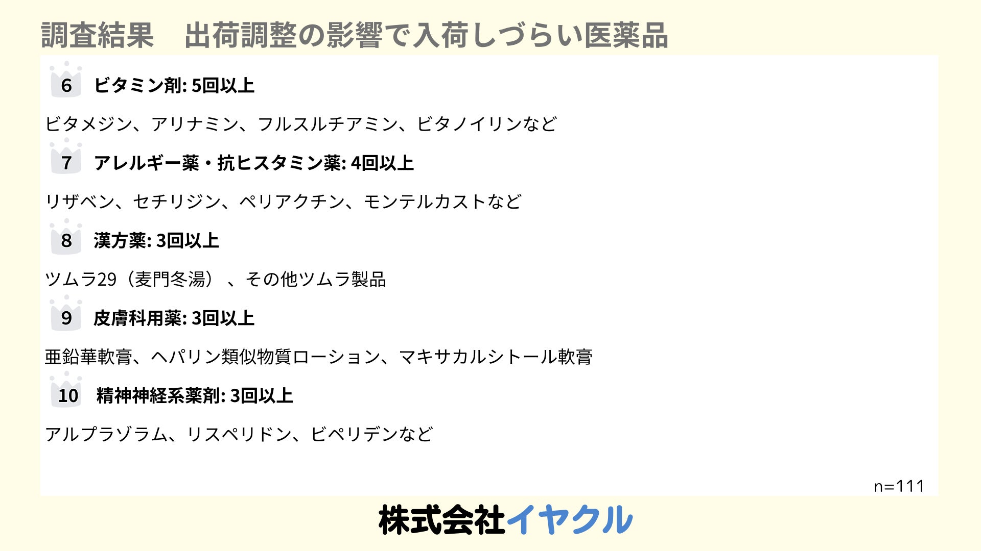 株式会社イヤクル(本社:北海道、代表取締役:佐孝尚)は、調剤薬局で働く薬剤師111名を対象に「医薬品供給不足に関するアンケート調査」を実施しました。調査では、特に出荷調整品や供給が不安定な医薬品が問題視され、リストアップされた医薬品は多岐にわたります。また、薬剤師からは「出荷調整品が多すぎて把握しきれない」との声も多数あり、医師とのコミュニケーションが不足してトラブルに発展するケースも明らかにされました。本プレスリリースでは、医薬品供給不足の実態とそれに対する課題を掘り下げていきます。