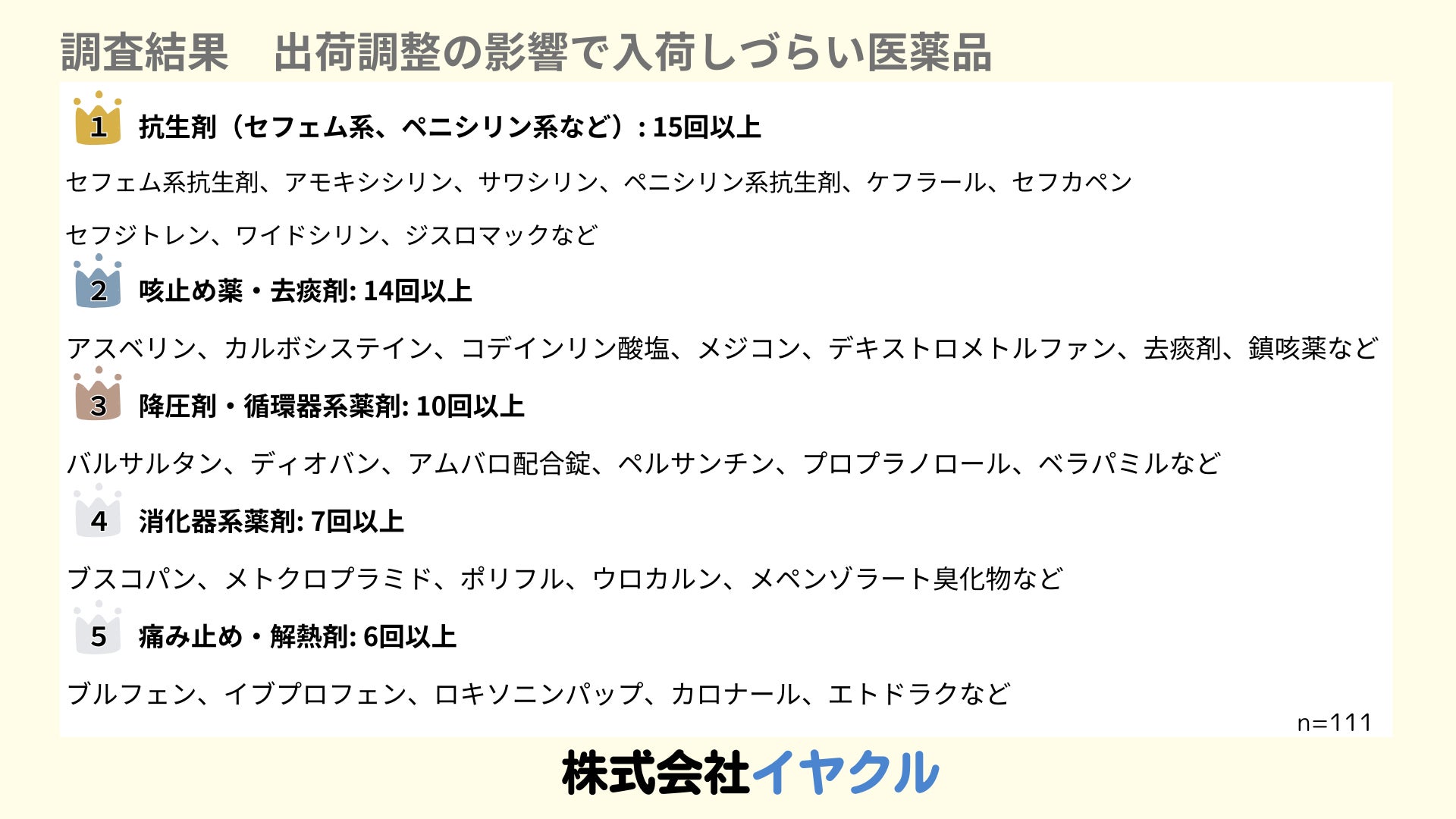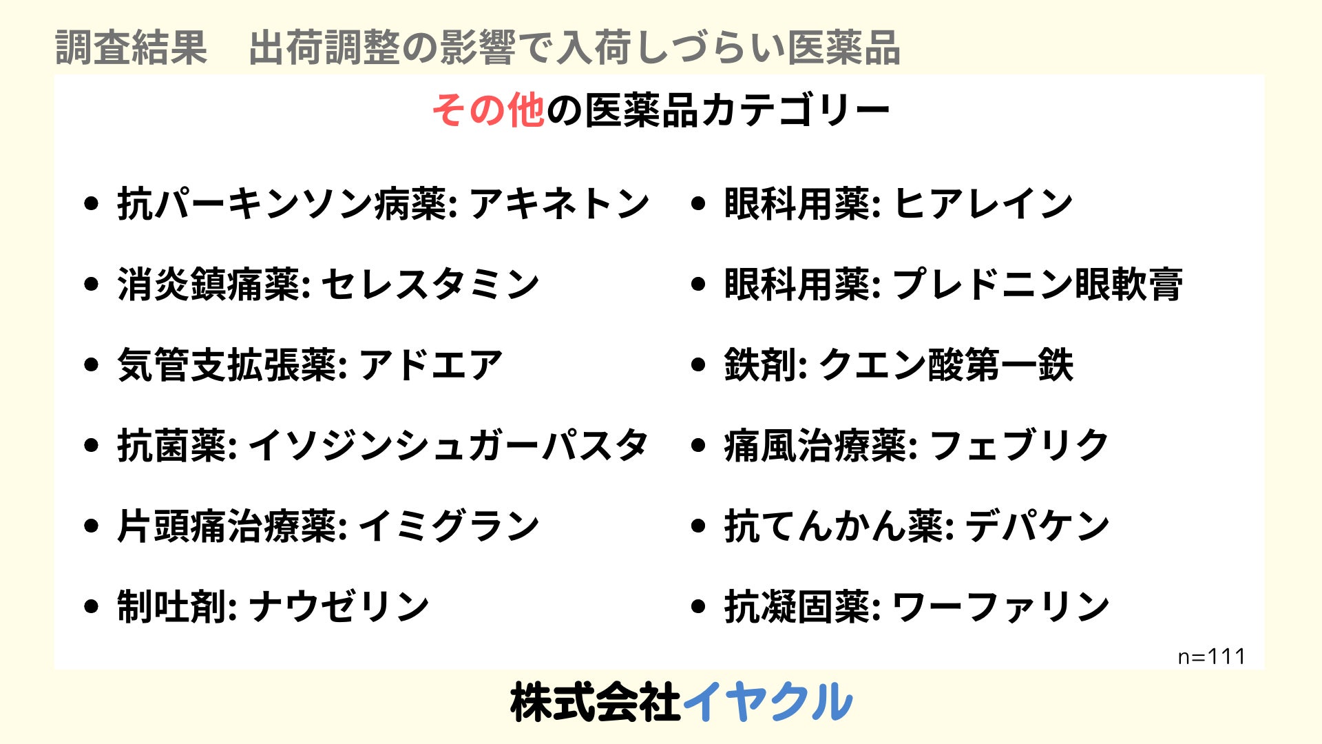 アンケートで最も多く挙げられた医薬品には以下のカテゴリーがあります
