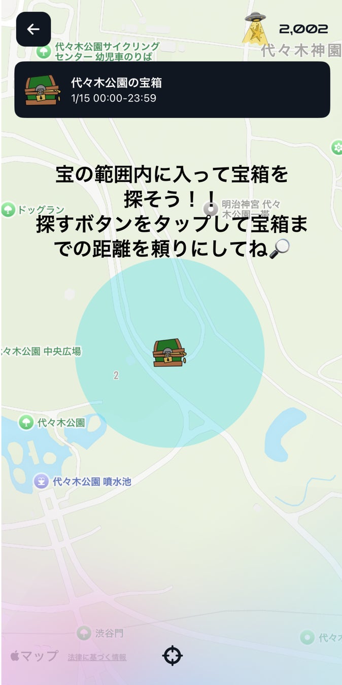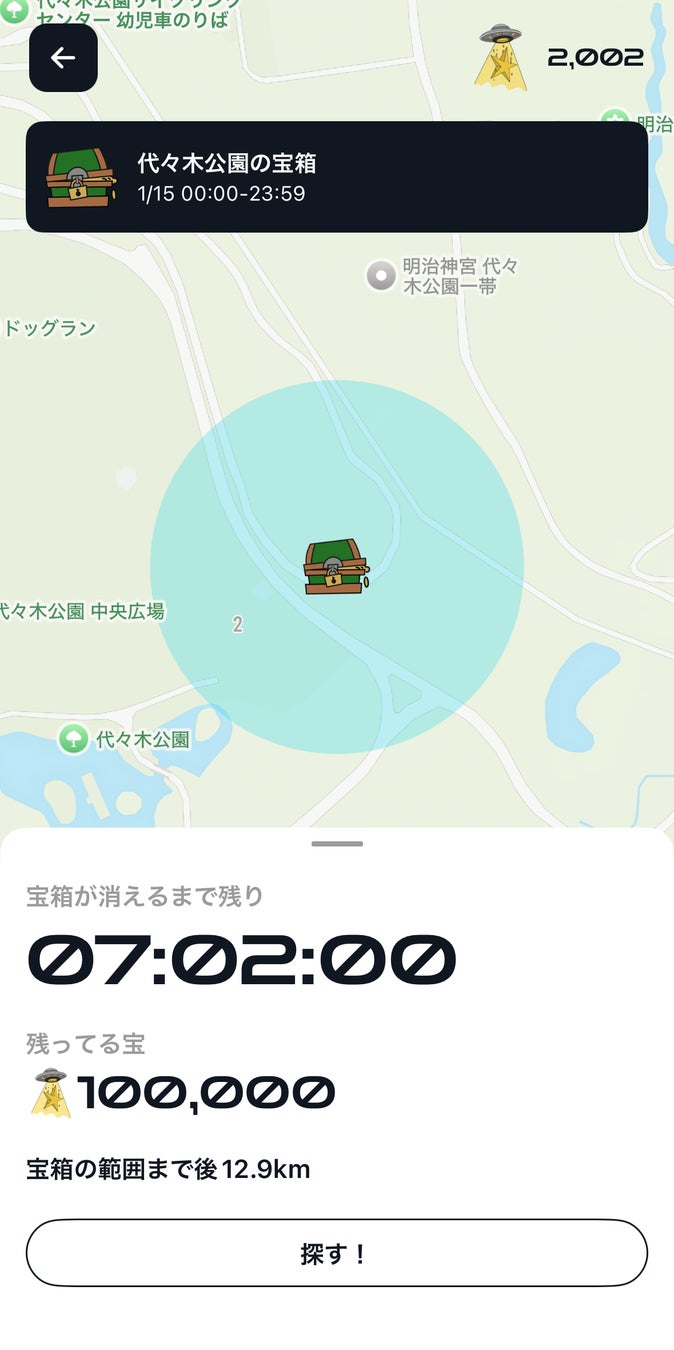 マップ上の範囲内に隠された宝箱を見つけ出し、「探す!」ボタンをタップすると、宝箱までの距離が表示されます。距離を頼りに宝を探しましょう! -