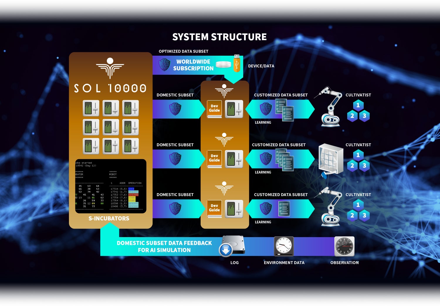メディソル株式会社が蓄積してきたメディカルガス溶存技術やその用途研究、豊富な培養プロトコール開発とその実証蓄積情報などから得られたビッグデータを活用した「SOL10000」は、多様な異なる培養プロトコールにも柔軟に対応でき、仕組みや仕様の異なるロボットでの培養から、バイオリアクターなど量産型培養システムのプロトコールまでもを制御することで、システム全体で複数の装置を遠隔統合制御することが可能です。また、それぞれを協調制御することによって、時限的・地理的・物理量的な確実性が必要とされる要求に対しても十分な成果を達成することが可能となります。これにより、場所を問わず、最先端の培養プロトコールが、AIによる統合仮想化環境においてシミュレーションされ、その結果を逐次それぞれの「SOL10000」ターミナルと共有し活用することができます。