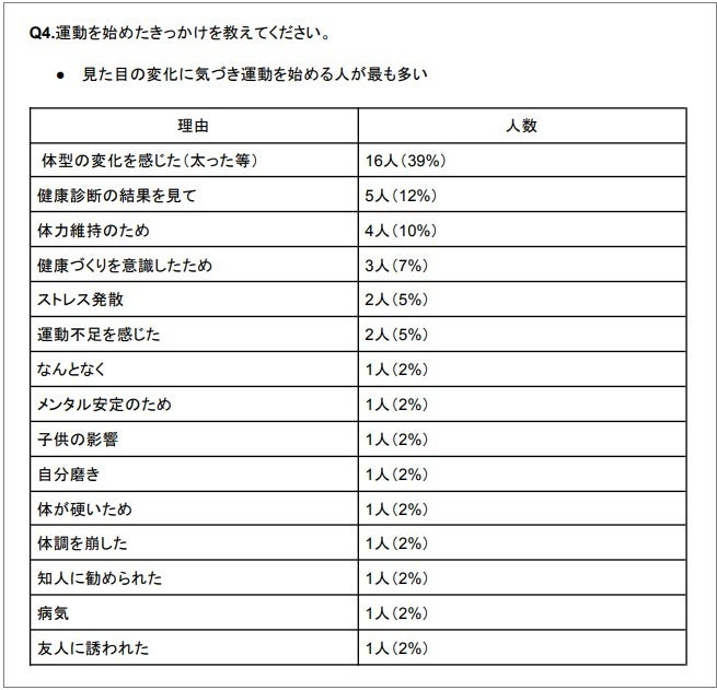 運動習慣のなかった人が運動を始めるきっかけは、体型の変化を感じた時が最多。他には健康診断の結果を見て、健康を意識する人も多いようです。