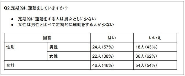多くの人が日常での運動不足を感じる一方で、定期的に運動をしている人は半数以下といった結果になりました。46%の人が定期的に運動をしています。