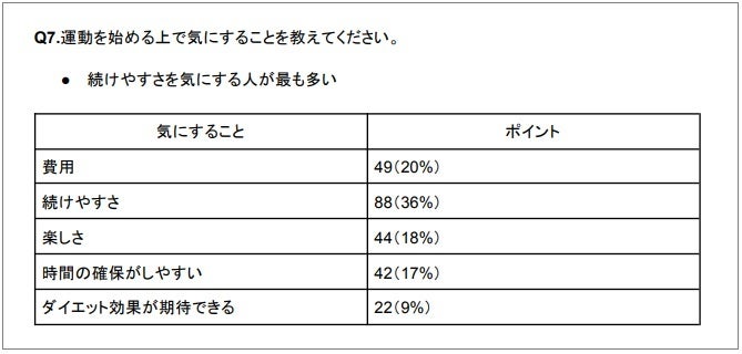運動を始める上で最も気にすることは「続けやすさ」となりました。負荷の軽い運動が人気であることを考えると、続けやすさを気にする人が多いことが分かります。