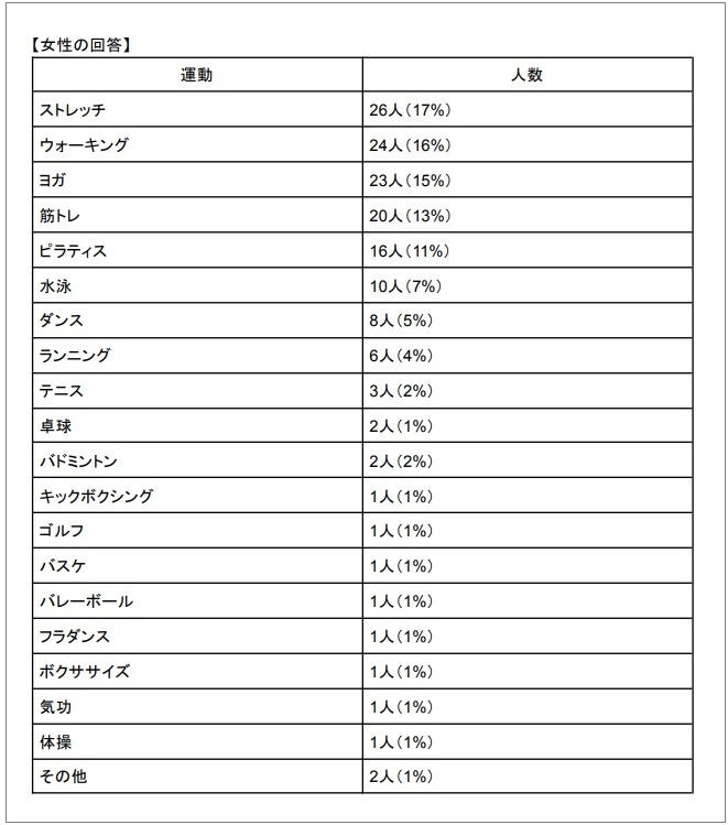 女性が運動不足解消のために、今後取り組んでみたい運動として多く挙げられるのがヨガ・ピラティスです。他にもストレッチやウォーキングといった比較的負荷の軽い運動が人気となっています。