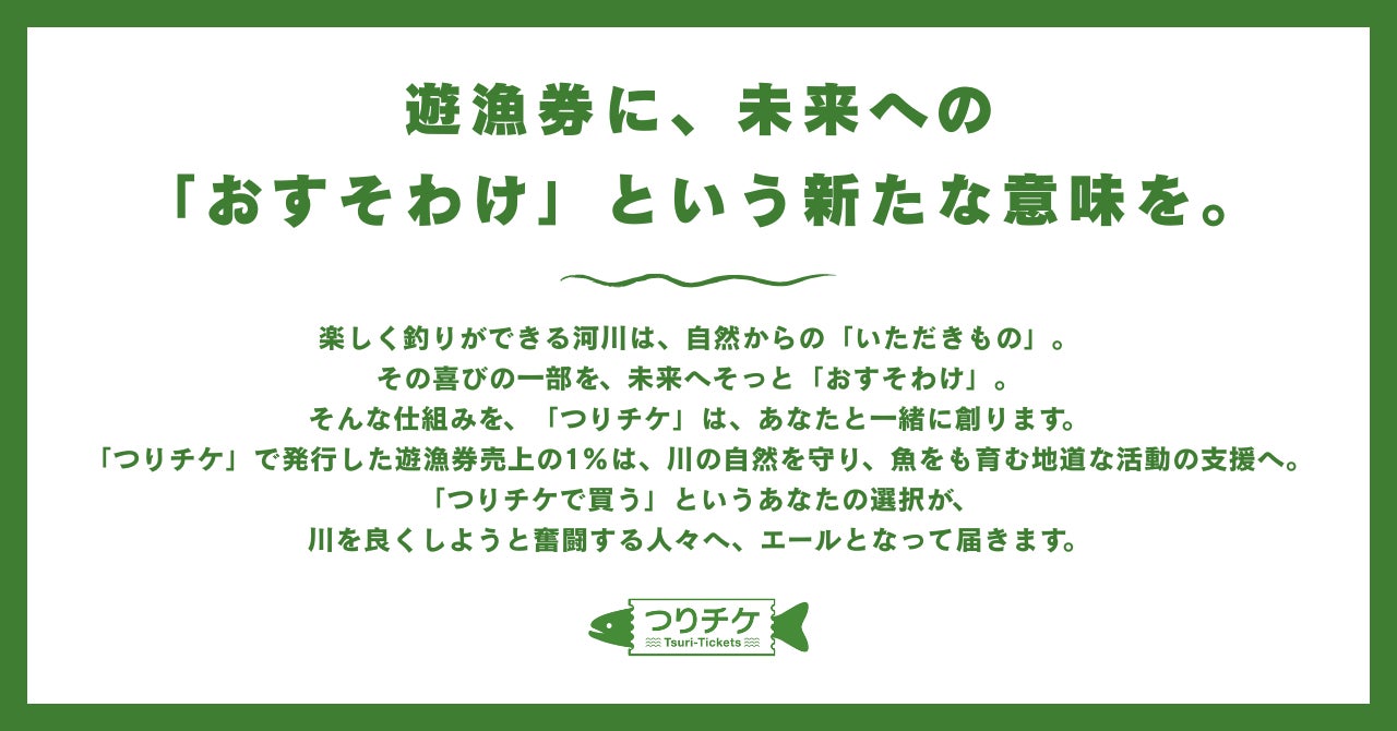 遊漁券のオンラインサービス「つりチケ」を運営する株式会社creato(本社:愛知県名古屋市、代表取締役:瀬川貴之)は、2025年6月7日から9月30日までの期間、つりチケでの遊漁券取扱高の1%を、豊かな水辺環境と水辺文化を維持・創出に取り組む団体へ寄付する『1% to rivers』を開始します。