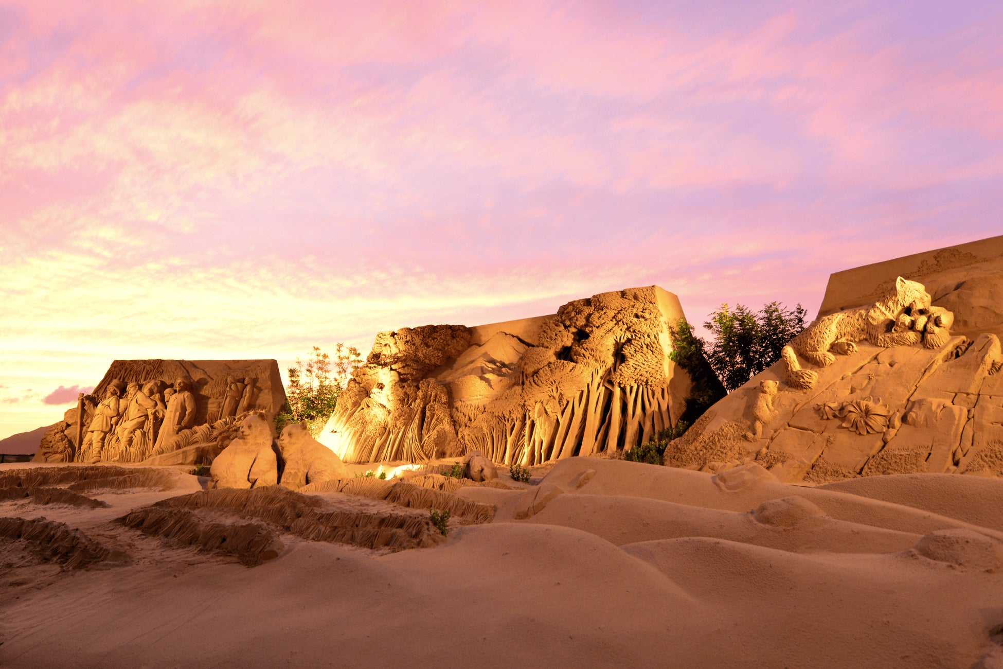 本展では、プロデューサーの茶圓勝彦(ちゃえんかつひこ)氏を迎え、世界のトッププロの砂像彫刻家7名が集結し、精巧で迫力のある砂の彫刻が展示されます。この数々の彫刻は朝・昼・夜の変化によってさまざまな表情を見せ、光と影の変化によっても表情を変え、訪れるたびに新しい発見があります。2024年の秋は、国内外の彫刻家がつくる砂像のほか、砂像連盟、砂像コンテスト等、全37基を予定しております。心に残る素晴らしい時間をお過ごしください。