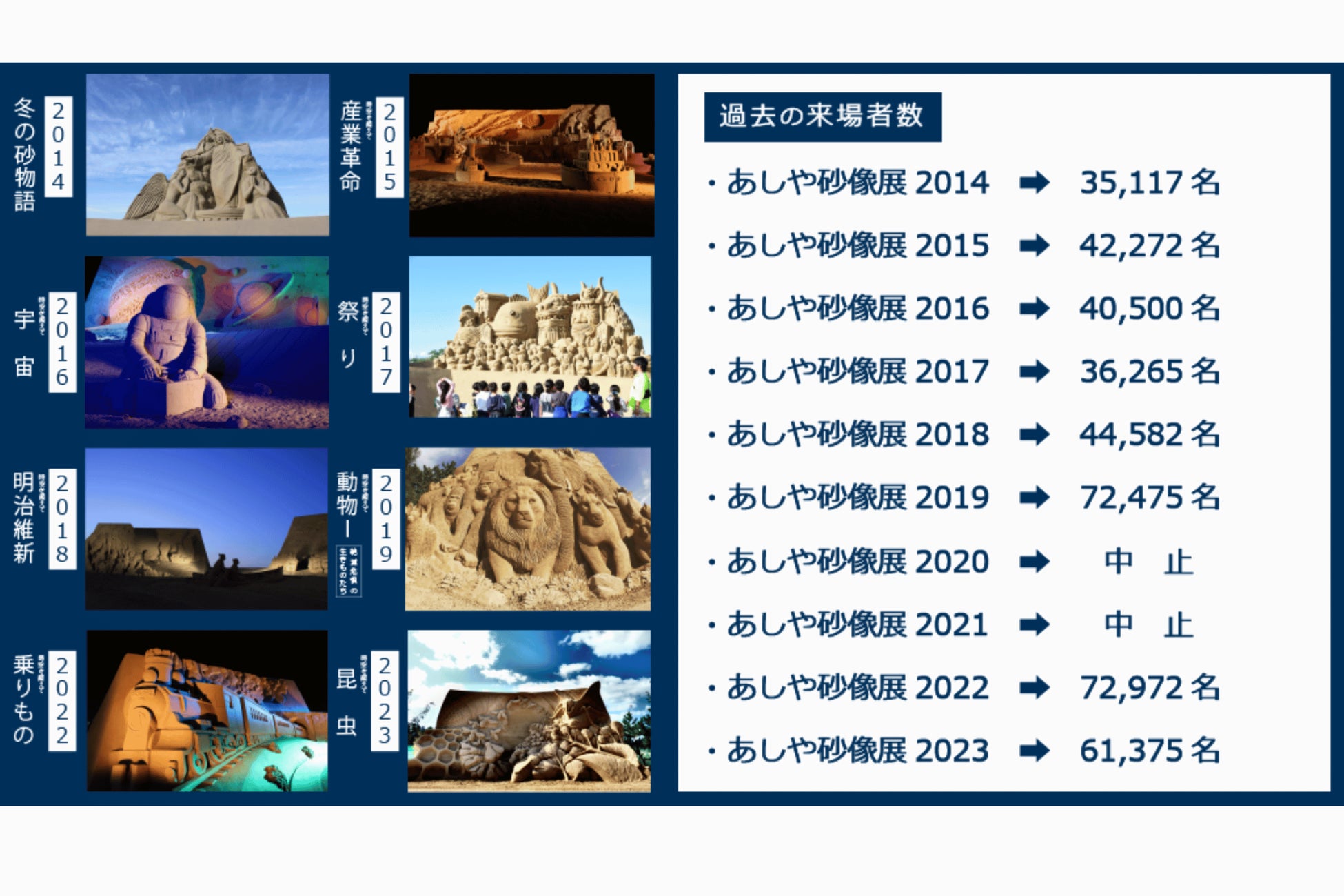 「あしや砂像展」 は、毎年テーマを変えて幅広い世代に楽しんでもらえる芦屋町の秋を彩るイベントとなっております。