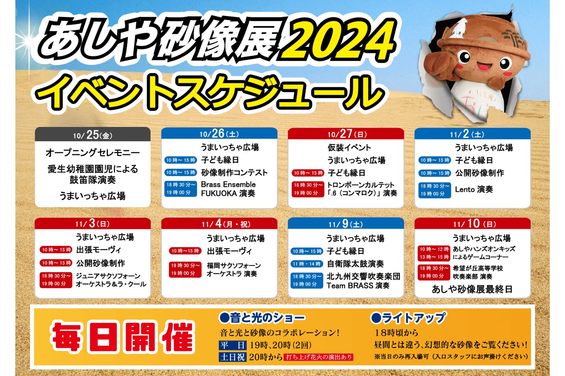 芦屋町、 あしや砂像展実行委員会(構成団体: 一般社団法人芦屋町観光協会他) は、2024年 10月25日 (金) から11月10日 (日)までの期間、 芦屋海浜公園レジャープールアクアシアン内の特設会場で 『あしや砂像展2024』 を開催いたします。