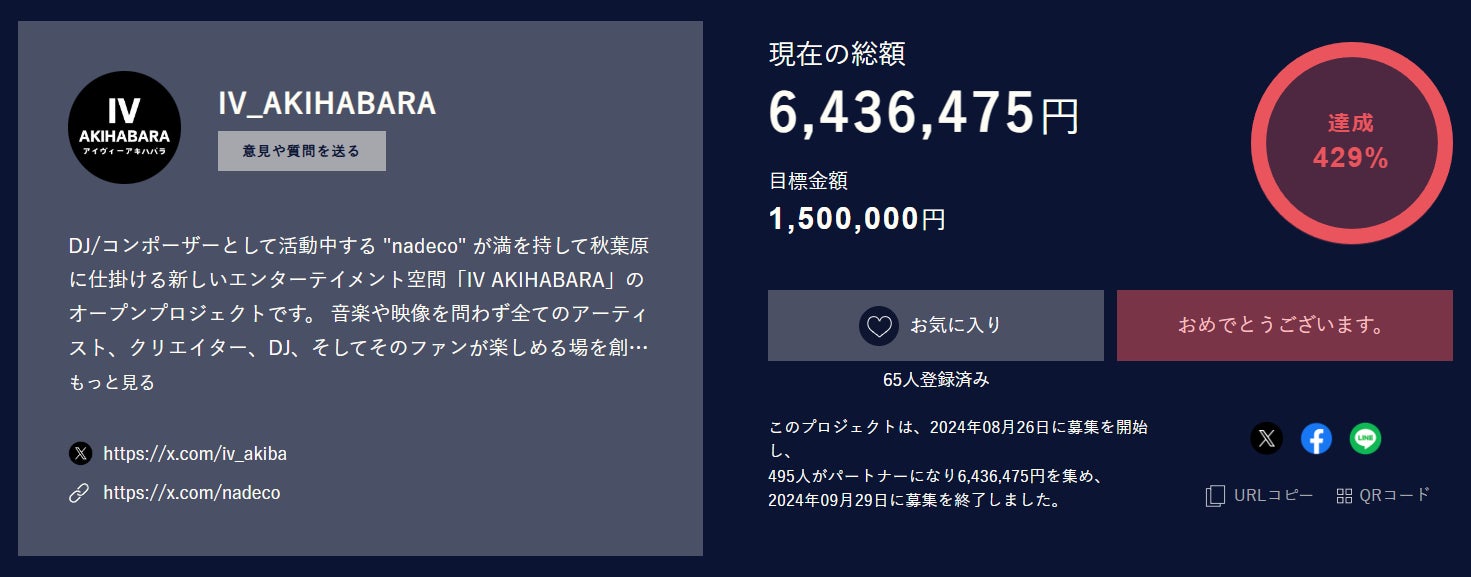 株式会社4x4(フォー・バイ・フォー 代表取締役:川池 翔)は、秋葉原エリアにおける音楽・クラブカルチャーの更なる発展を目指しスタートした「DJ/CREATORS BAR “IV AKIHABARA”(アイヴィー・アキハバラ)」のオープンに関するクラウドファンディングが、延べ495名から総額6,436,475円の支援を集め、目標額の429%にてプロジェクトを完了した事をご報告致します。
