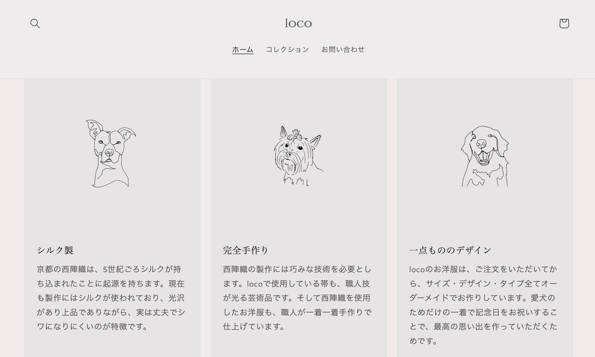 西陣織ドッグウェアブランドlocoは、愛犬のための高級ドッグウェアや犬用小物、レンタル&撮影体験を提供するブランドです。