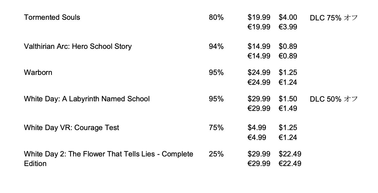 セール対象の全タイトルと、それぞれの割引・価格の一覧は以下を参照してください: