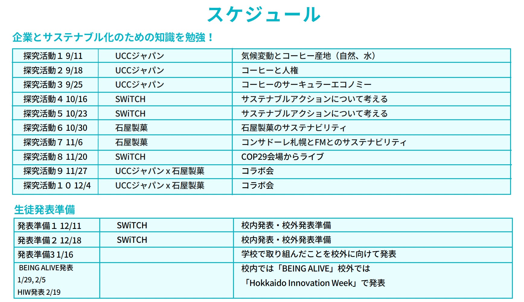 SWiTCHは2024年度も「BEING ALIVE」に協力することを決定。さらに北海道の地元企業として高い知名度を誇るISHIYAと、先進的なサステナビリティの取り組みで知られるUCCジャパン株式会社とも連携し、高校生が環境問題について幅広い視野を養いアクションを起こすことを目指します。