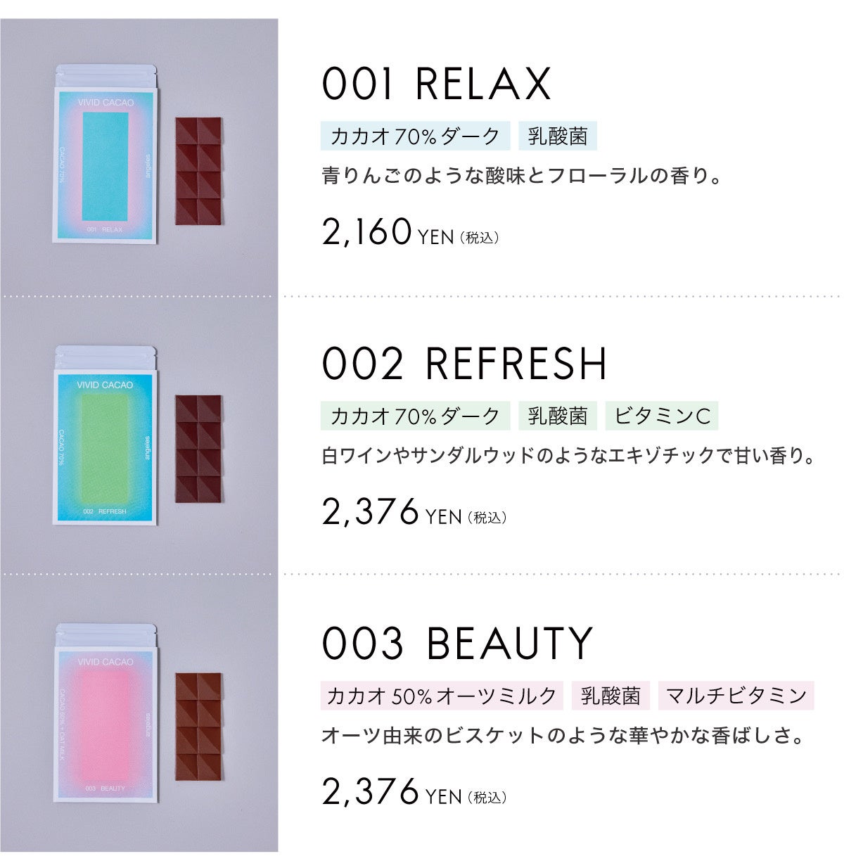 タイ産カカオ豆を使用し、ハイカカオでもフルーティで爽やかな口当たりを実現しました。 さらに全てのチョコレートに乳酸菌を配合。予防医学士監修のビタミンも加わり、楽しみな がらあなたの輝く明日をサポートします。