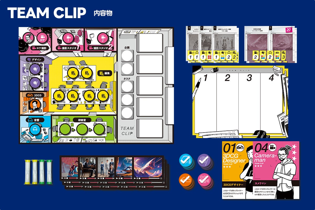 本プロジェクトでは、自律型人材の育成をテーマにしたボードゲーム「TEAM CLIP」本体及びゲーム研修プランを提供します。「TEAM CLIP」は映像制作会社を舞台に、日々舞い込んでくるタスクをこなしつつ、大型プロジェクトをチームで完遂させることを目指す協力型の研修用ボードゲームです。募集期間は2024年9月30日(月)までとし、この期間内に限り支援を受け付けております。