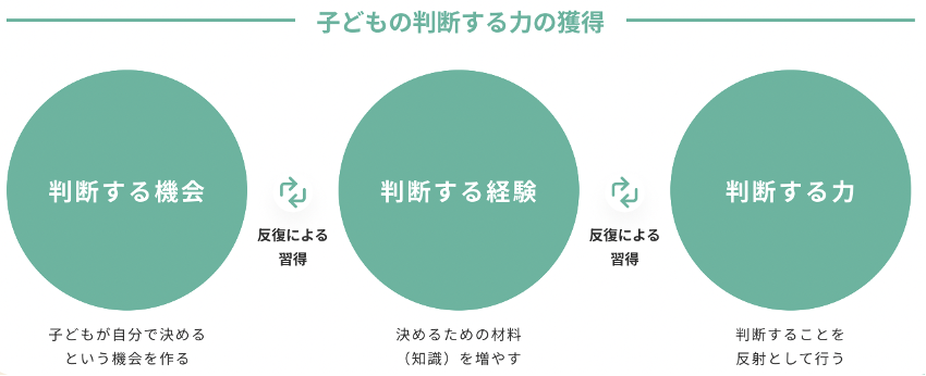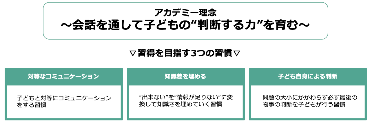 本アカデミーでは、テクノロジーの発展によって子どもたちを取り巻く環境が変化し、子どもが子ども自身で判断しなければいけない場面の低年齢化に着目し「会話を通して子どもの“判断する力”を育む」を理念として定めています。また、「対等なコミュニケーション」、「知識さを埋める」、「子ども自身による判断」を上記理念に基づいた習慣とするべき3つの要素として掲げ、習得に必要な独自的且つ専門的なカリキュラムをご用意しています。