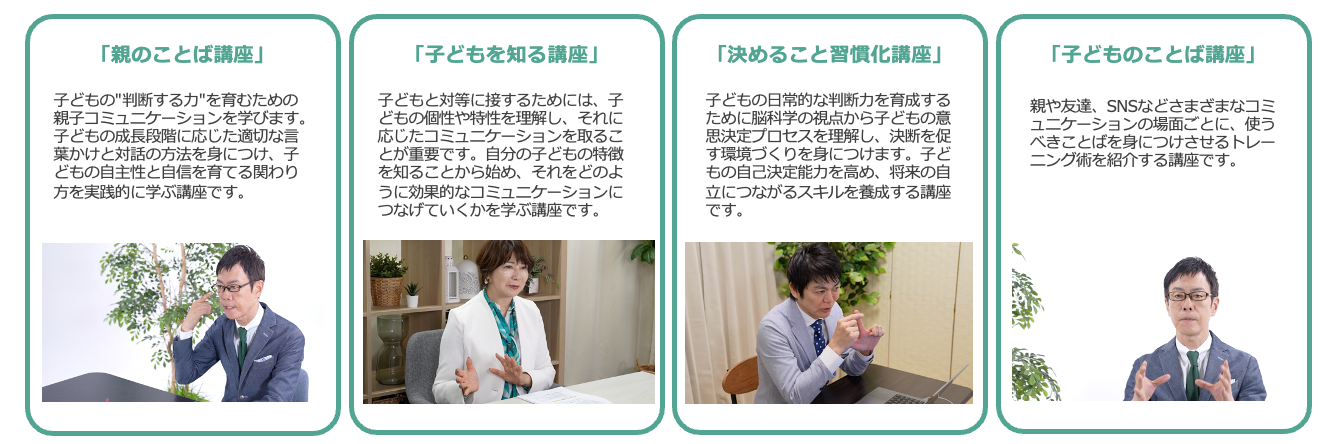 「親のことば講座」「子どもを知る講座」「決めること習慣化講座」「子どものことば講座」
