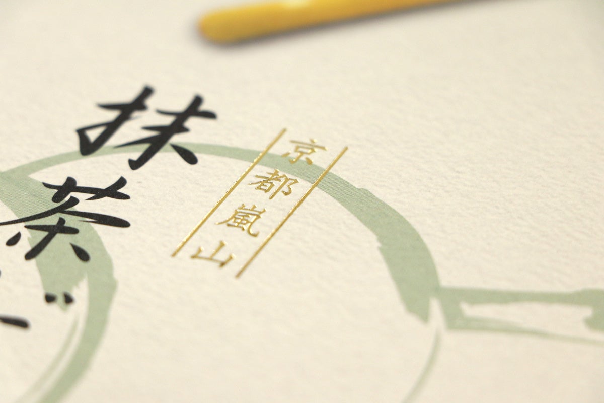 箱の商品名の「京都嵐山」の部分には金色の箔押しをし、シンプルながら高級感を演出しています。