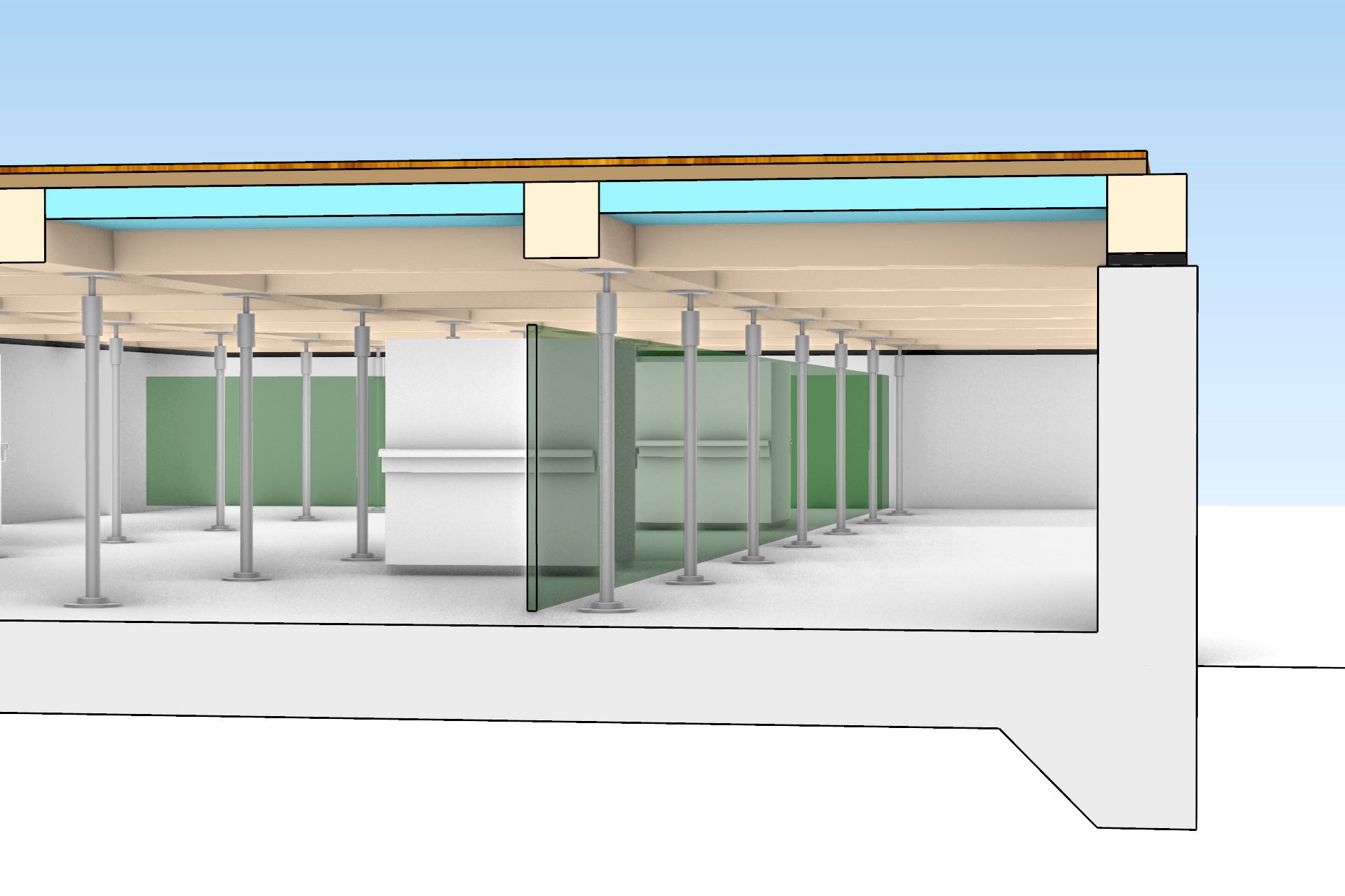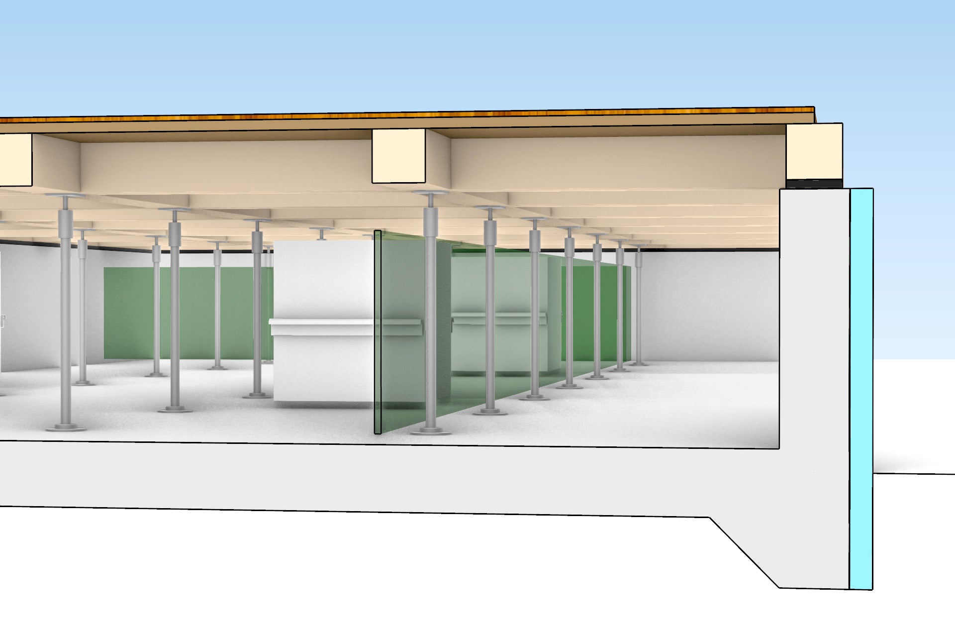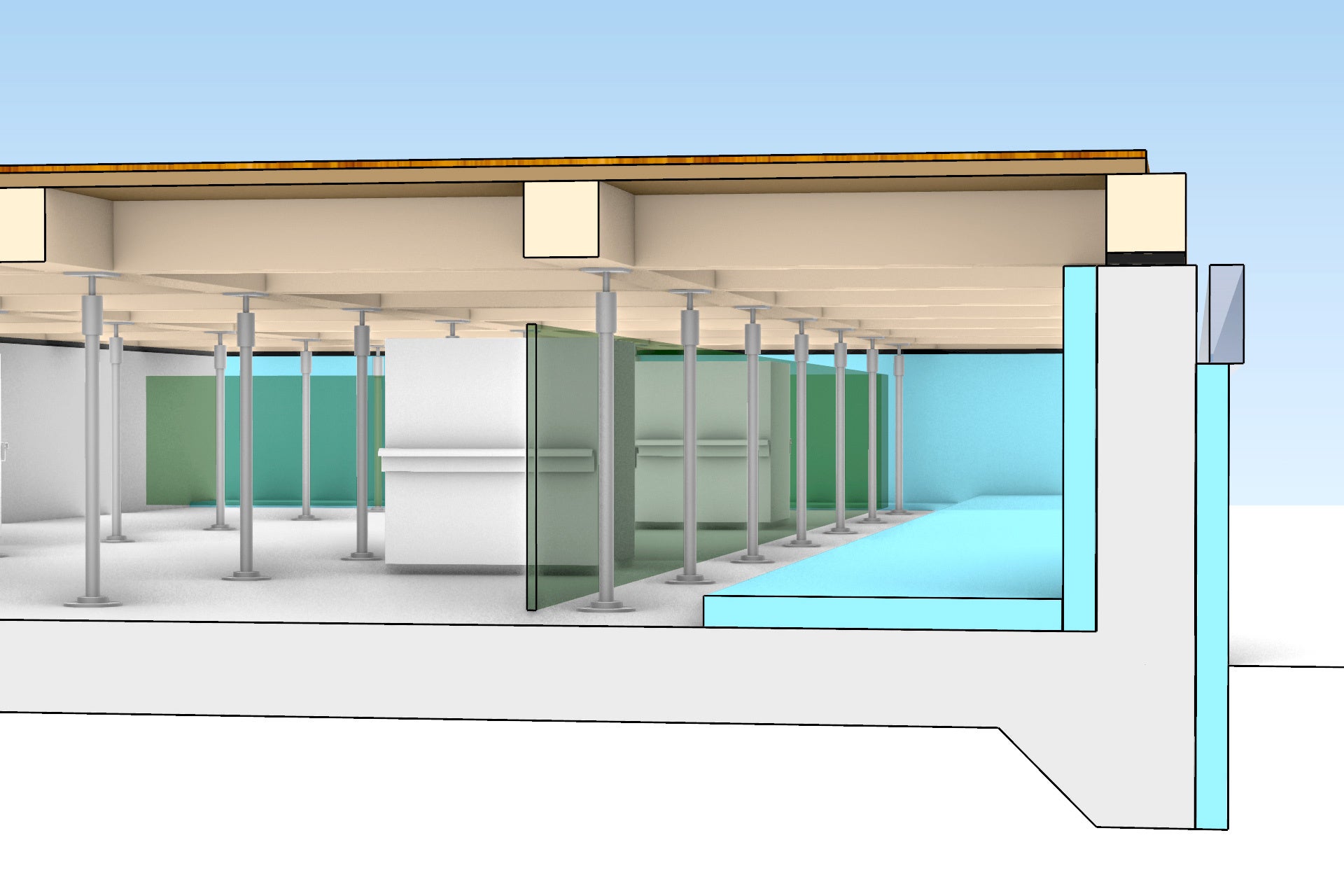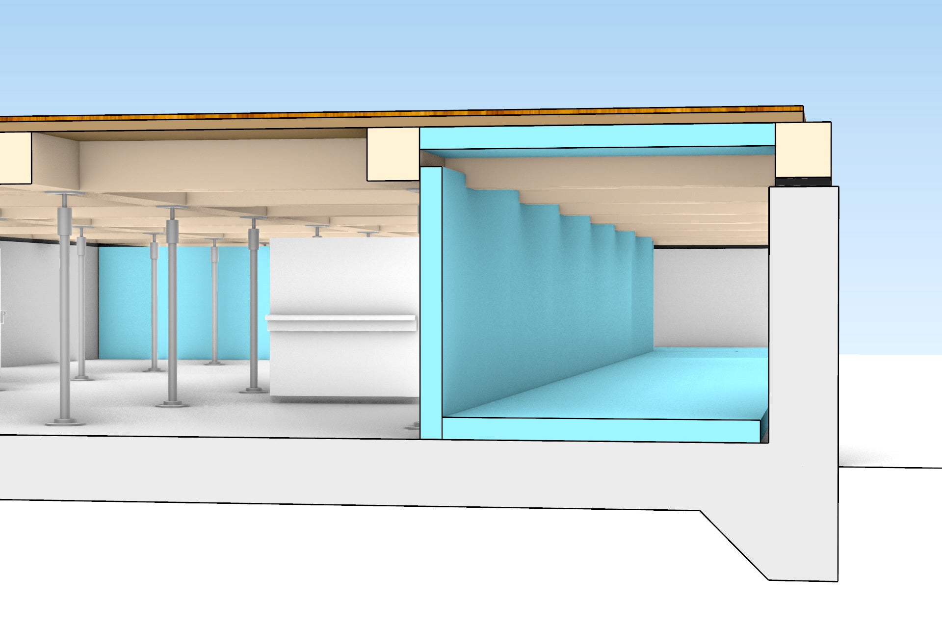 プール断熱と同様、収納空間以外は床下断熱となりますが、収納空間を囲うパネルの外側底面にも断熱材をプラスし、底面コンクリートから伝わる熱を遮断します。
