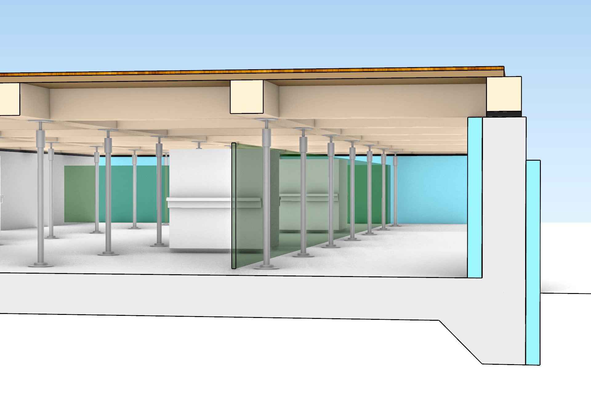 住宅の地域環境や、求める断熱性能により、底面断熱材の面積は増減します。この時、収納空間やエレベーターへの干渉等を考慮する必要があるため、設計難易度は高くなります。また、パケットパス設置部分はその他の部分と同様の断熱施工ができないため、弱点となり得ます。