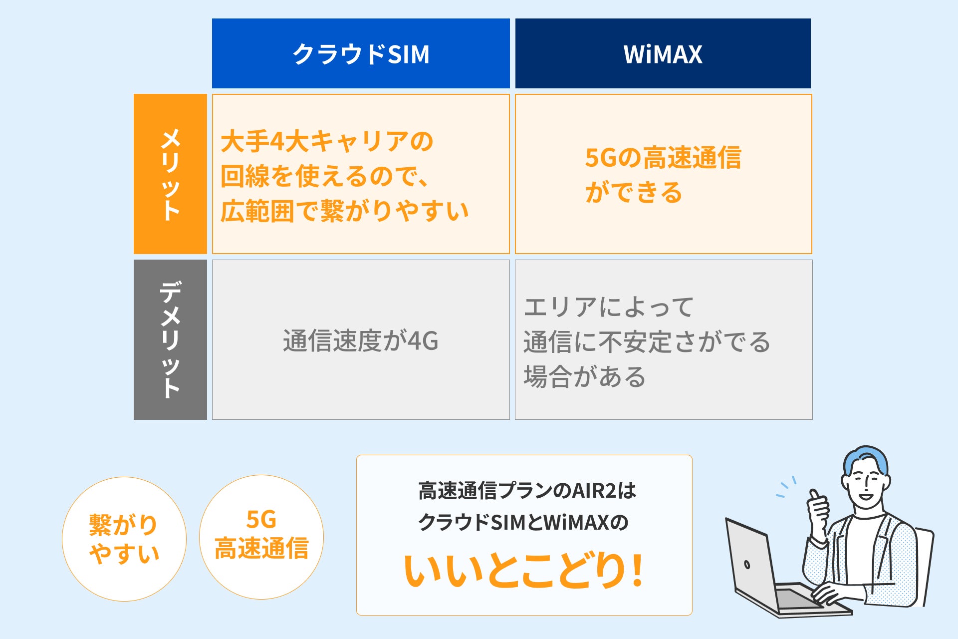 高速通信プランでご利用いただける「AIR-2」は、広範囲で繋がりやすいクラウドSIMの性質と、5G通信ができるWiMAXの性質をどちらも兼ねたモバイルWiFiです。