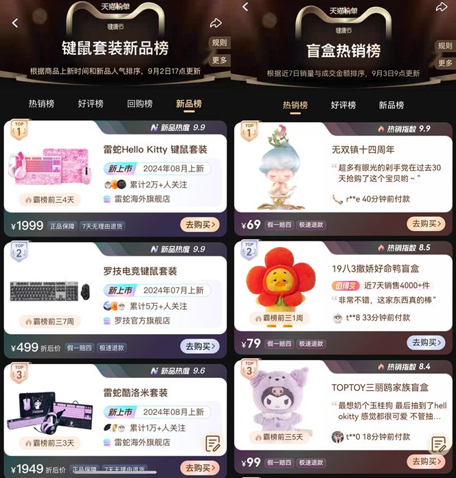 Razerとサンリオのコラボによる新商品「Hello Kittyキーボード&マウスセット」および「クロミキーボード&マウスセット」は、天猫のキーボード&マウスセットランキングで新品カテゴリーの第1位と第3位を連日独占しました。TOPTOYが販売するサンリオ家族の「ラテベイビービニール人形ブラインドボックス」は7月の発売以来、熱気が冷めることなく、10万人以上の関心を集め、ブラインドボックス販売ランキングでトップ3にランクインしました。