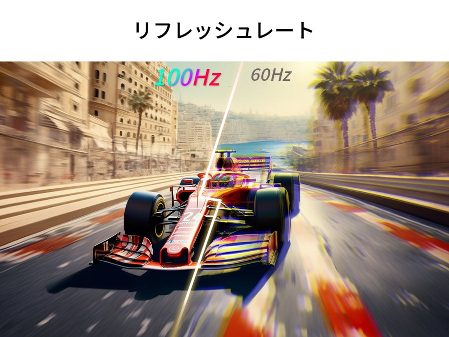 従来の60Hzを超える100Hzのリフレッシュレートが、動きの速い映像もスムーズに表示。スポーツ観戦やアクション映画、ゲームプレイでの残像感を大幅に軽減します。さらに、フリーシンクとGシンクに対応し、映像のティアリングやスタッタリングを防止。快適でシームレスな視聴体験を保証します。