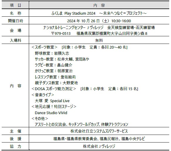 株式会社日立システムズパワーサービス(代表取締役 取締役社長:南 邦明、本社:東京都港区/以下、日立システムズパワーサービス)は、2024年10月26日にナショナルトレーニングセンター Jヴィレッジ(福島県双葉郡楢葉町)において、「ふくしま Play Stadium 2024 ~未来へつなぐ=プロジェクト~」を開催いたしました。