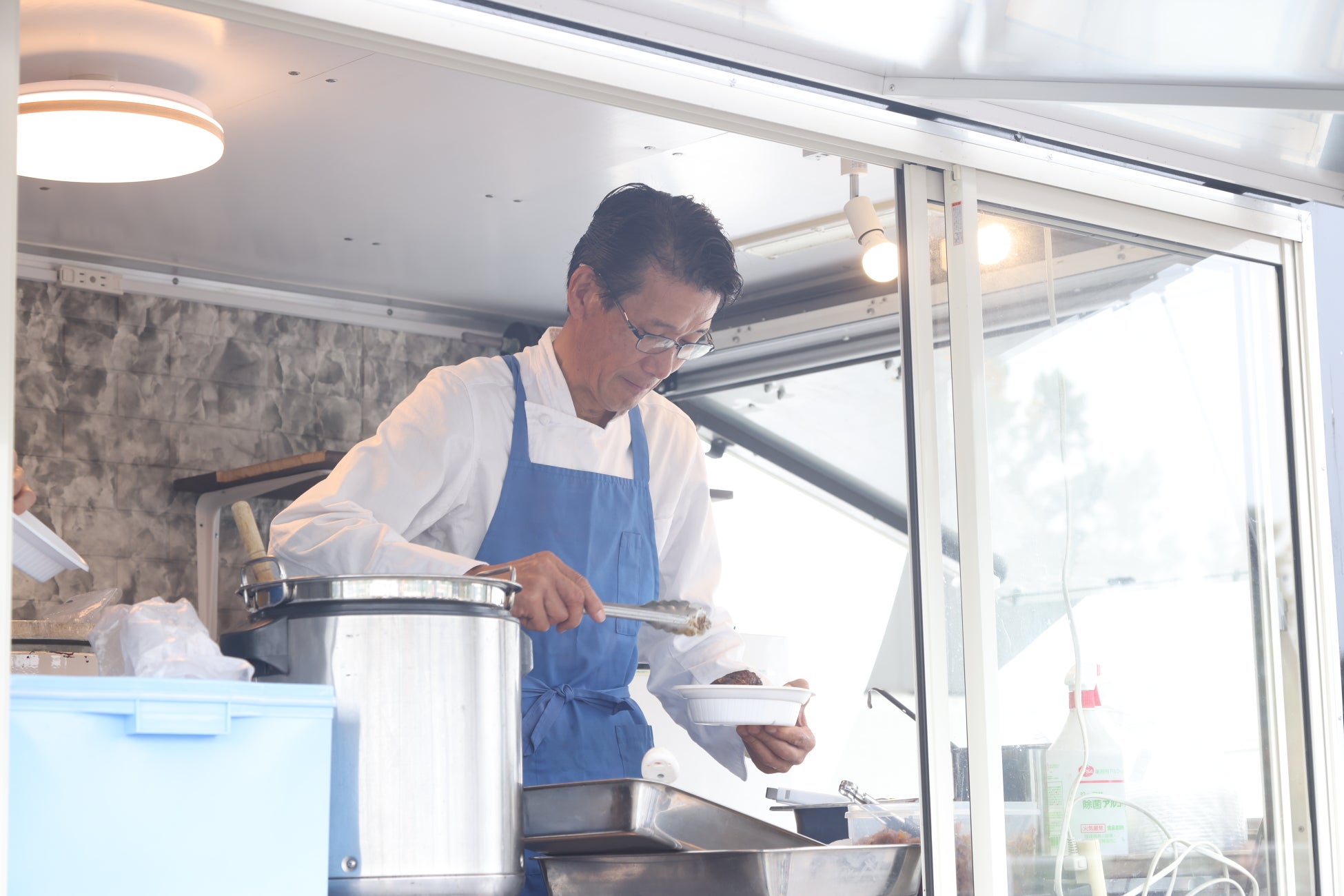 サッカー日本代表等の帯同シェフ・西芳照さんがキッチンカーで「日本代表カレー」を提供しました。数多くの海外遠征の中で、選手たちの緊張をほぐし、食欲がわくメニューを提供してきた西シェフのカレーとあって、大人気でした。その他にもインドやトルコ、イタリア、ドイツなど世界各国の料理を味わえるキッチンカーを用意し、多くの人が楽しみました。